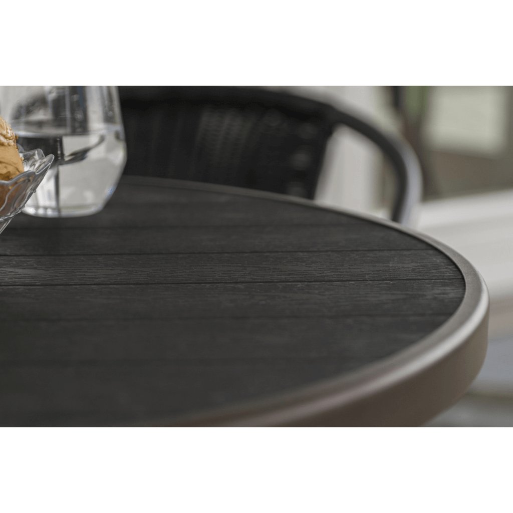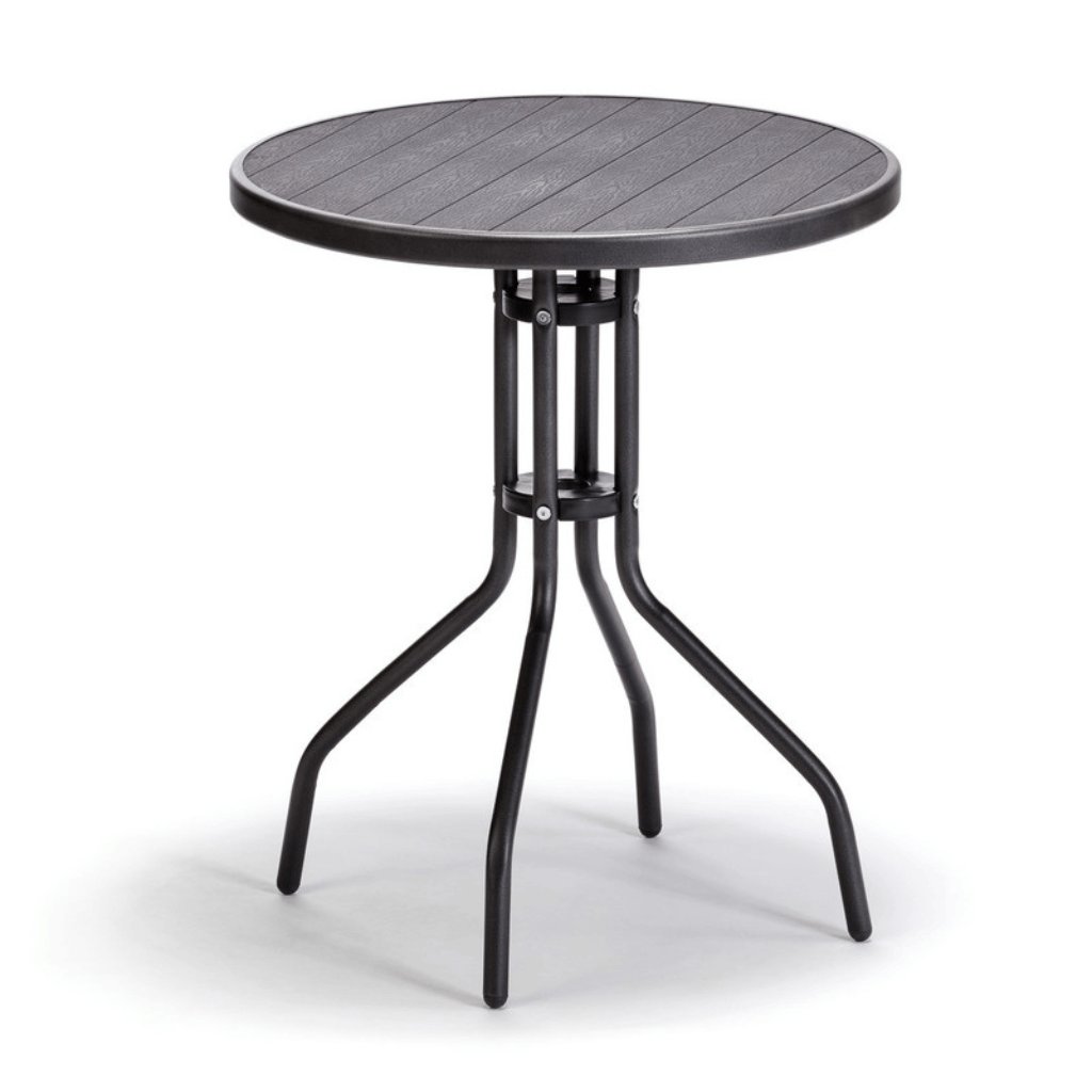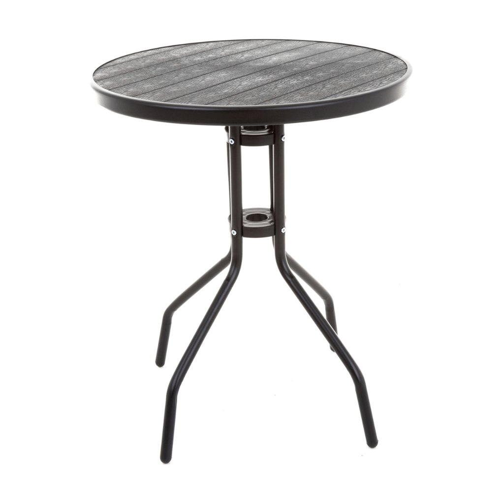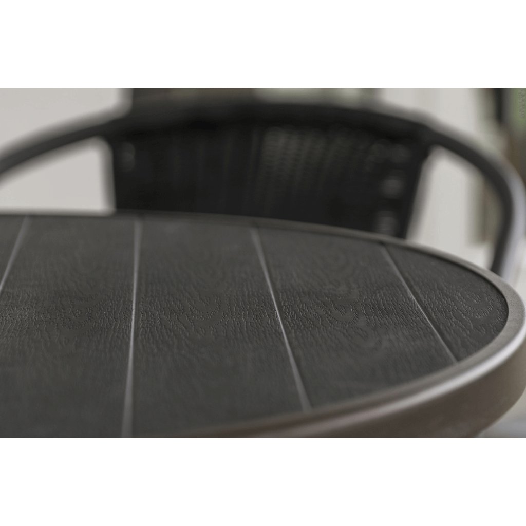 Stôl má okrúhlu dosku z artwoodu. Jedná sa o bezúdržbový syntetický materiál, ktorý poteší oko svojou prirodzene vyzerajúcou štruktúrou pripomínajúcou drevo.