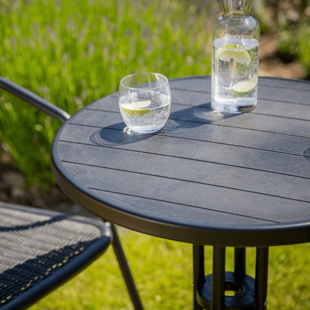 Okrúhly balkónový stôl s oceľovou konštrukciou NONA - kompaktné riešenie pre vonkajšie posedenie