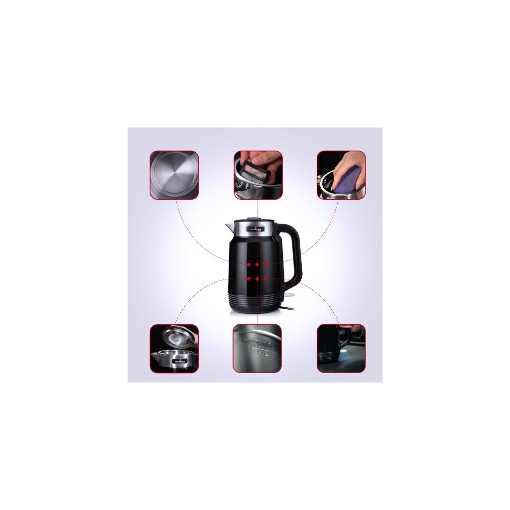 Bezpečnosť zaisťuje automatické vypnutie, ochrana proti prehriatiu a ochrana proti chodu naprázdno. Pohodlie pri používaní poskytuje otočná základňa 360°, praktický poklop Snap-on lid a ukazovateľ hladiny vody.
