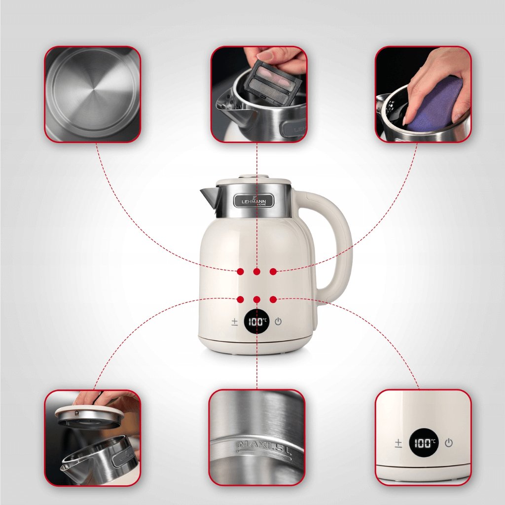 Dotykový panel s LED displejom zabezpečuje jednoduché a intuitívne ovládanie, podsvietenie LED dodáva spotrebiču eleganciu a bezpečnosť zaručuje automatické vypnutie, ochrana proti prehriatiu a ochrana proti chodu naprázdno. O pohodlie sa postará otočná základňa 360°, praktické snap-on viečko a sieťový filter vody.