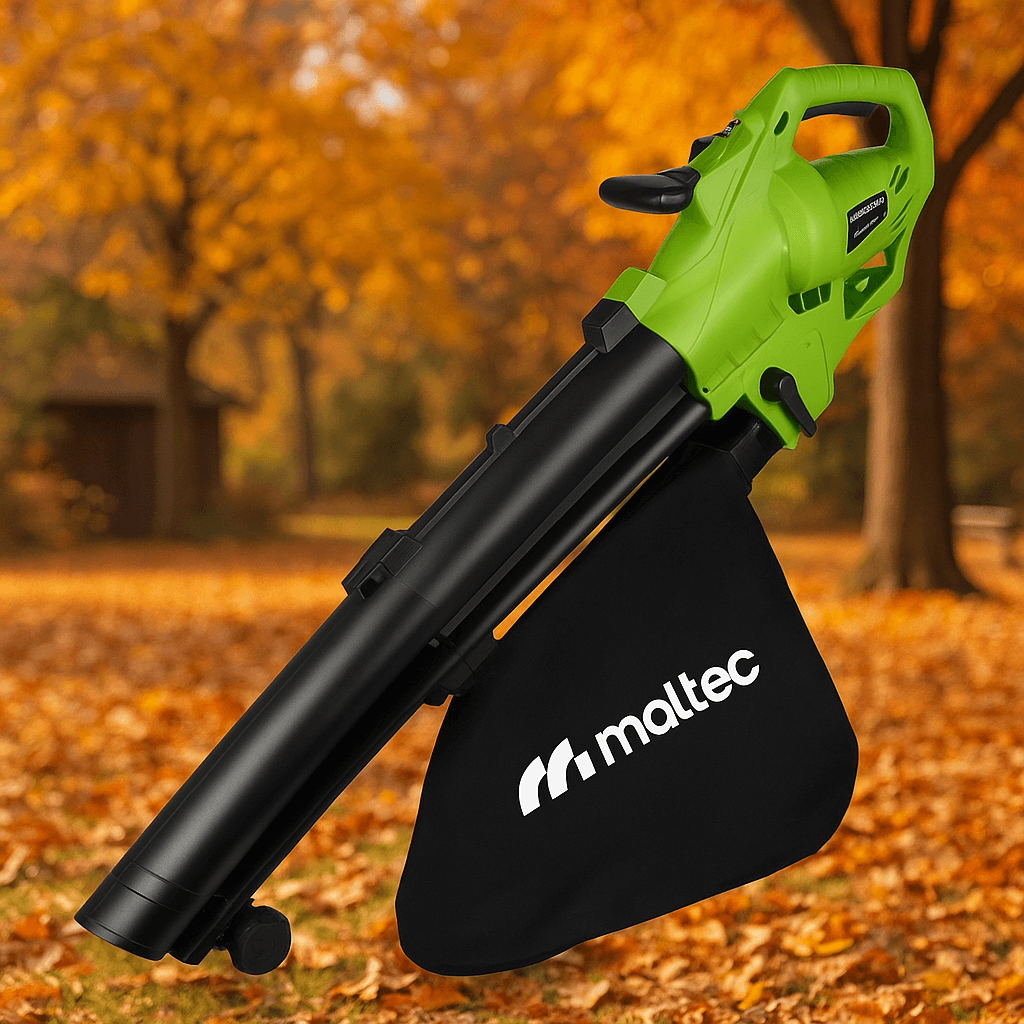 Elektrický záhradný fúkací stroj na lístie, vysávač a drvič v jednom.