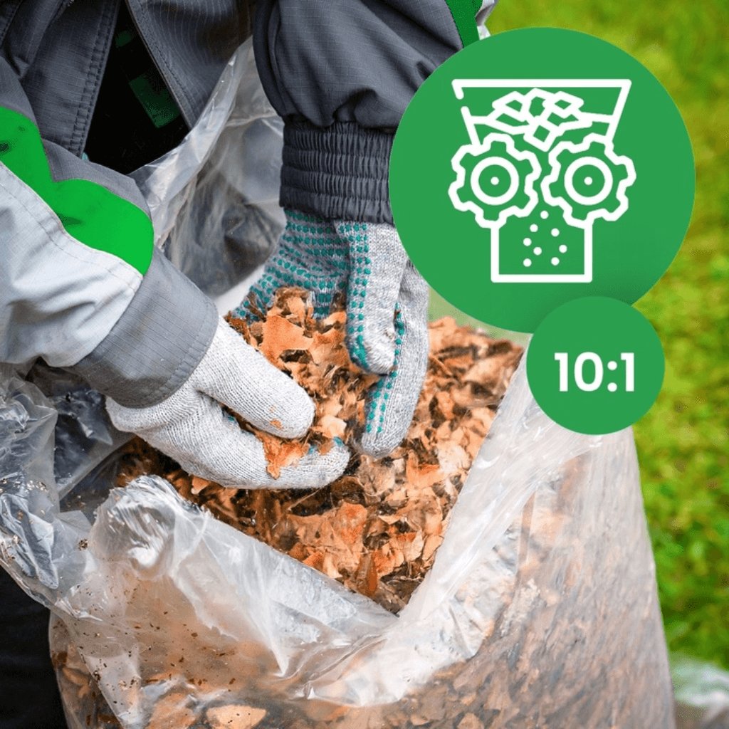 Integrovaný nůž uvnitř zařízení slouží k drcení nasávaného listí, čímž komprimuje jeho objem v poměru10:1