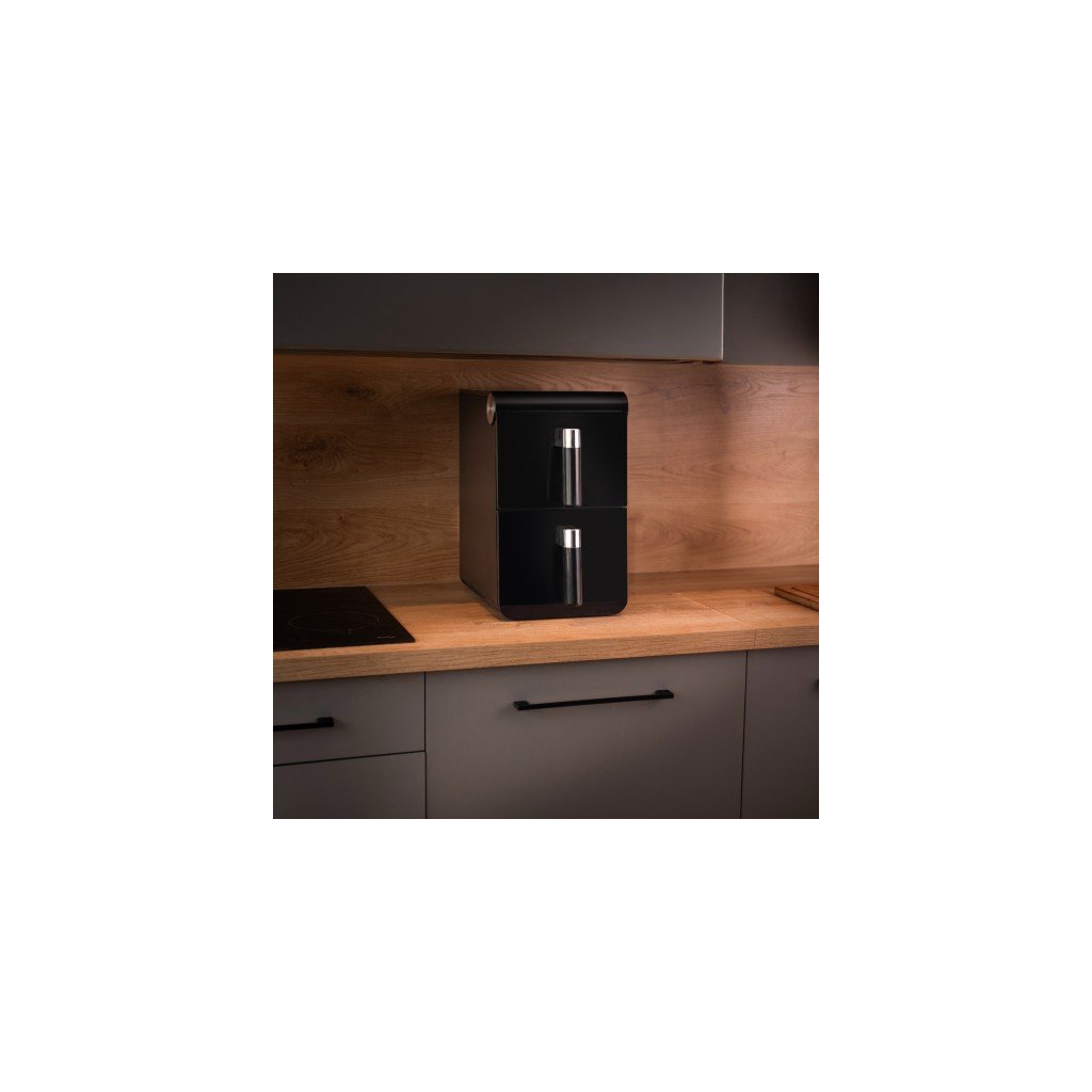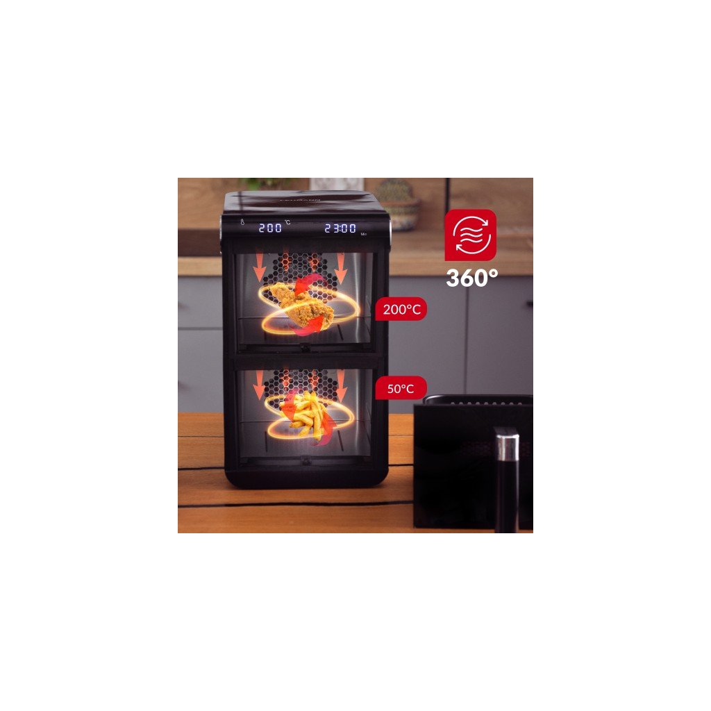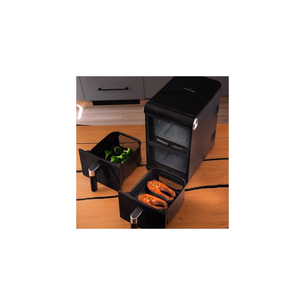Máme pre to riešenie! Dvouúrovňová beztuková fritéza s príkonom 2800 W a objemom 11 litrov pečie a smaží dva pokrmy naraz.