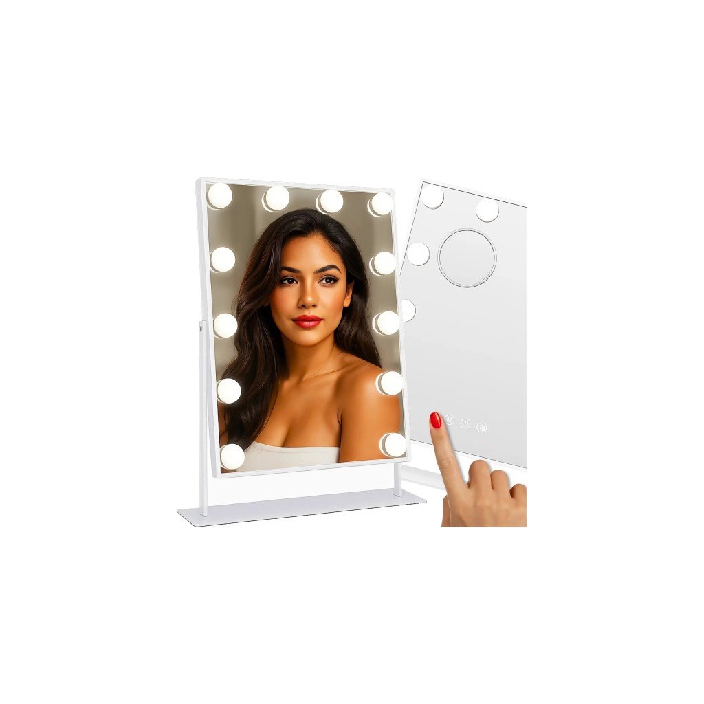 HOLLYWOOD LED ZRCADLO NA LÍČENÍ – stojací kosmetické zrcátko s 12 LED, dotykové ovládání a nastavitelný jas