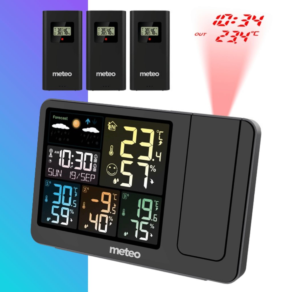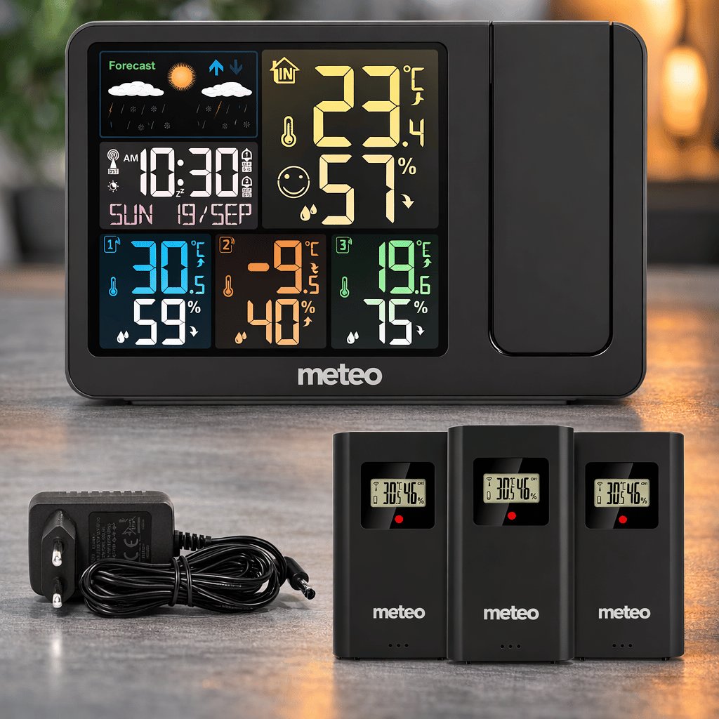 Bezdrôtová meteorologická stanica s funkciami teplomera, hygrometra, barometra, predpovede počasia a hodín. Dodávaná s bezdrôtovým vonkajším čidlom s dosahom až 100 m.