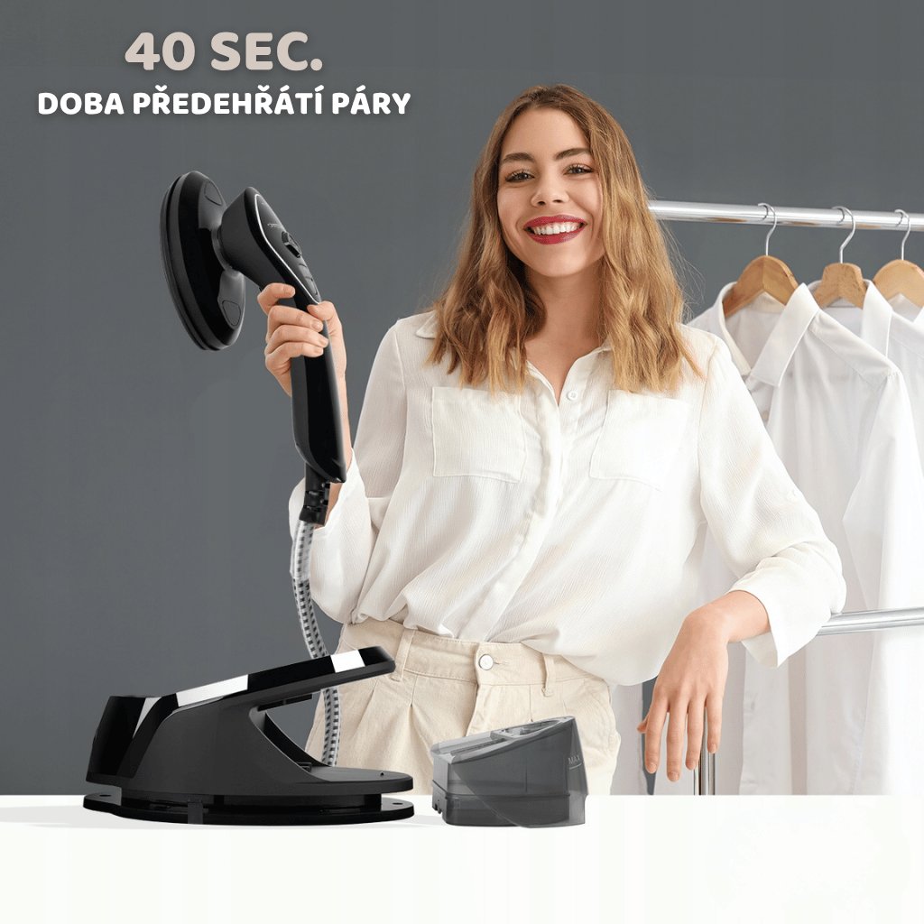 Parní napařovač je výkonné zařízení s výkonem 2500 W, které zaručuje rychlé předehřívání za pouhých 40 sekund a efektivní žehlení různých tkanin.
