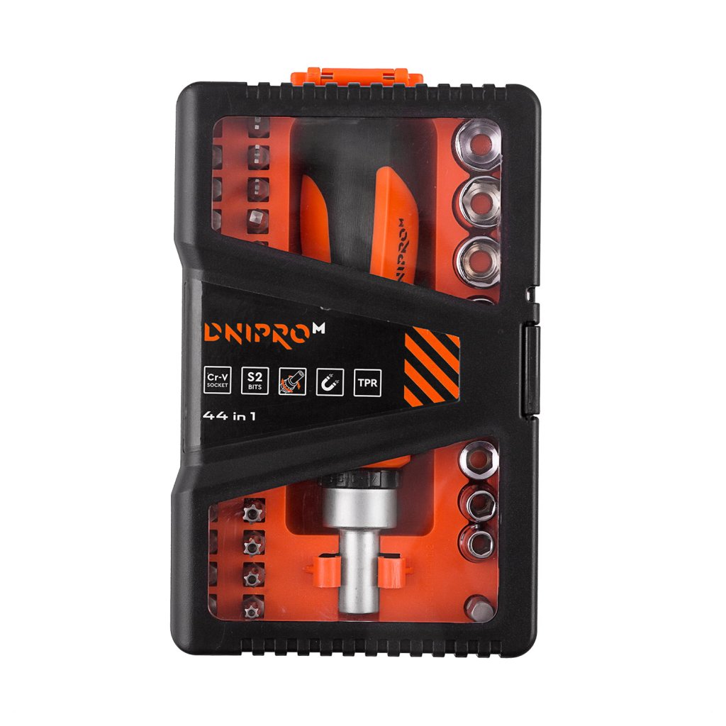 Každý ze 44 bitů v sadě Dnipro-M je vyroben z vysokopevnostnej ocele S2, ktorá zaisťuje zvýšenú odolnosť proti zlomeniu. Majú magnetickú základňu, vďaka ktorej sú pevne uchytené vo skrutkovači. Materiál hlavíc je oceľ SR-V.Náradie je vybavené robustným reverzibilným račňovým mechanizmom so 72 zubami. Vďaka pogumovanej dvojdielnej rukoväti sa skrutkovač pri práci ľahko drží.
