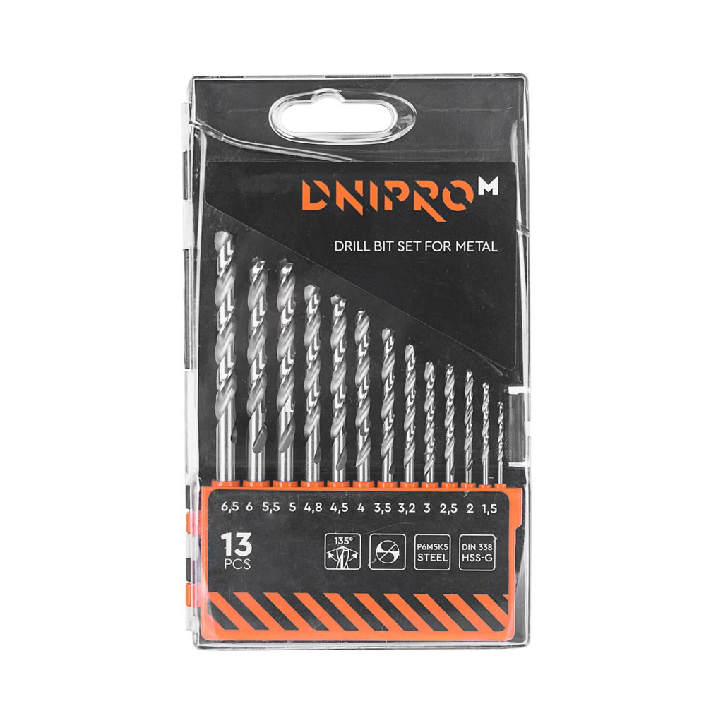 Sada obsahuje 13 vrtákov do kovu rôznych veľkostí, ktoré sa hodia pre akékoľvek použitie. Dĺžka a priemer od 45 do 101 mm, resp. od 1,5 do 6,5 mm. Opakovane použiteľný plastový obal uľahčuje skladovanie a prepravu sady.Vrtáky do kovu sú vhodné na prácu s neželeznými aj železnými kovmi a tvrdými plastmi. Vrtáky do kovu Dnipro-M majú vysoko kvalitnú rýchlo reznú oceľ P6M5K5. Vysokej odolnosti a nízkej lámavosti je dosiahnuté pridaním wolframu a molybdénu do zliatiny..