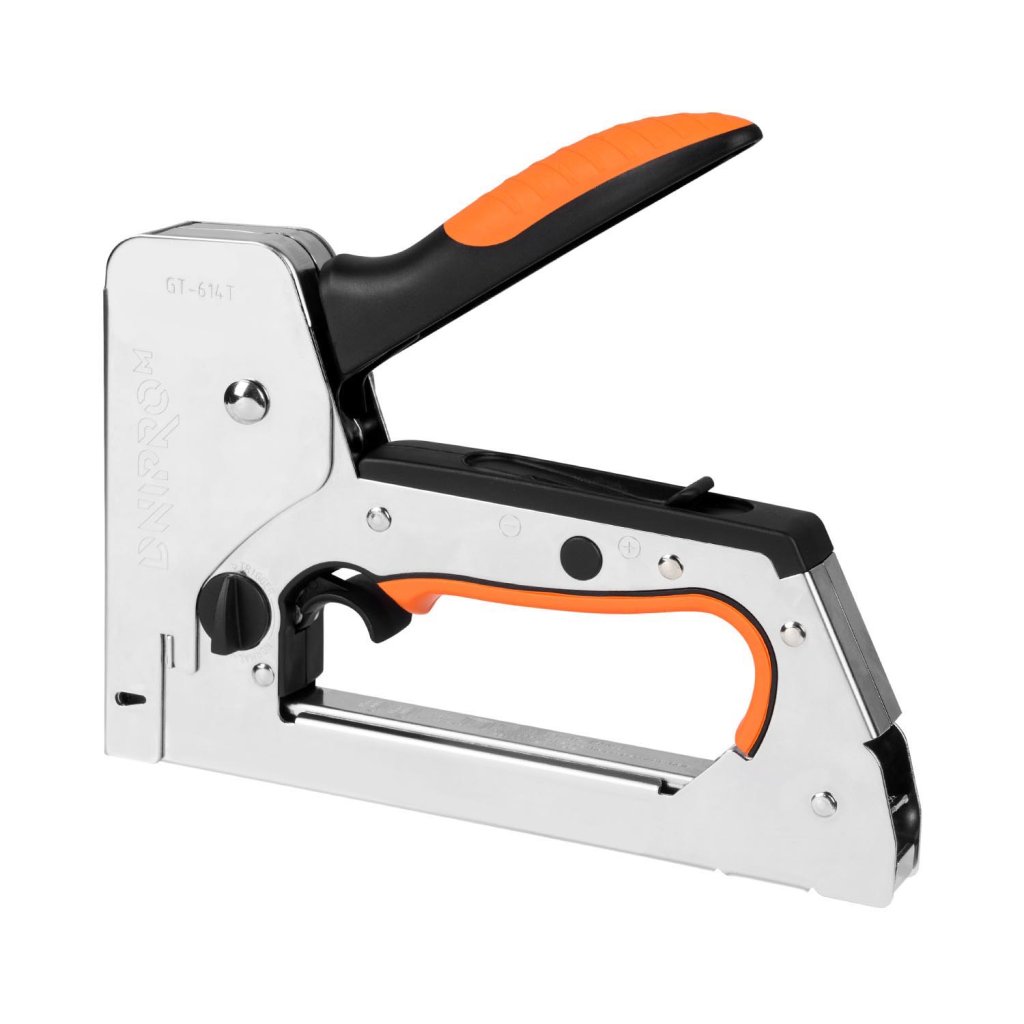 Stavebná zošívačka Dnipro-M GT-614T je určená na upevňovanie povrchov, rýchle čalúnenie alebo opravy nábytku. Pracuje so sponami, hmoždinkami a klincami s priemerom 6-14 mm. Zošívačka je pripravená na intenzívne použitie profesionálnymi užívateľmi.