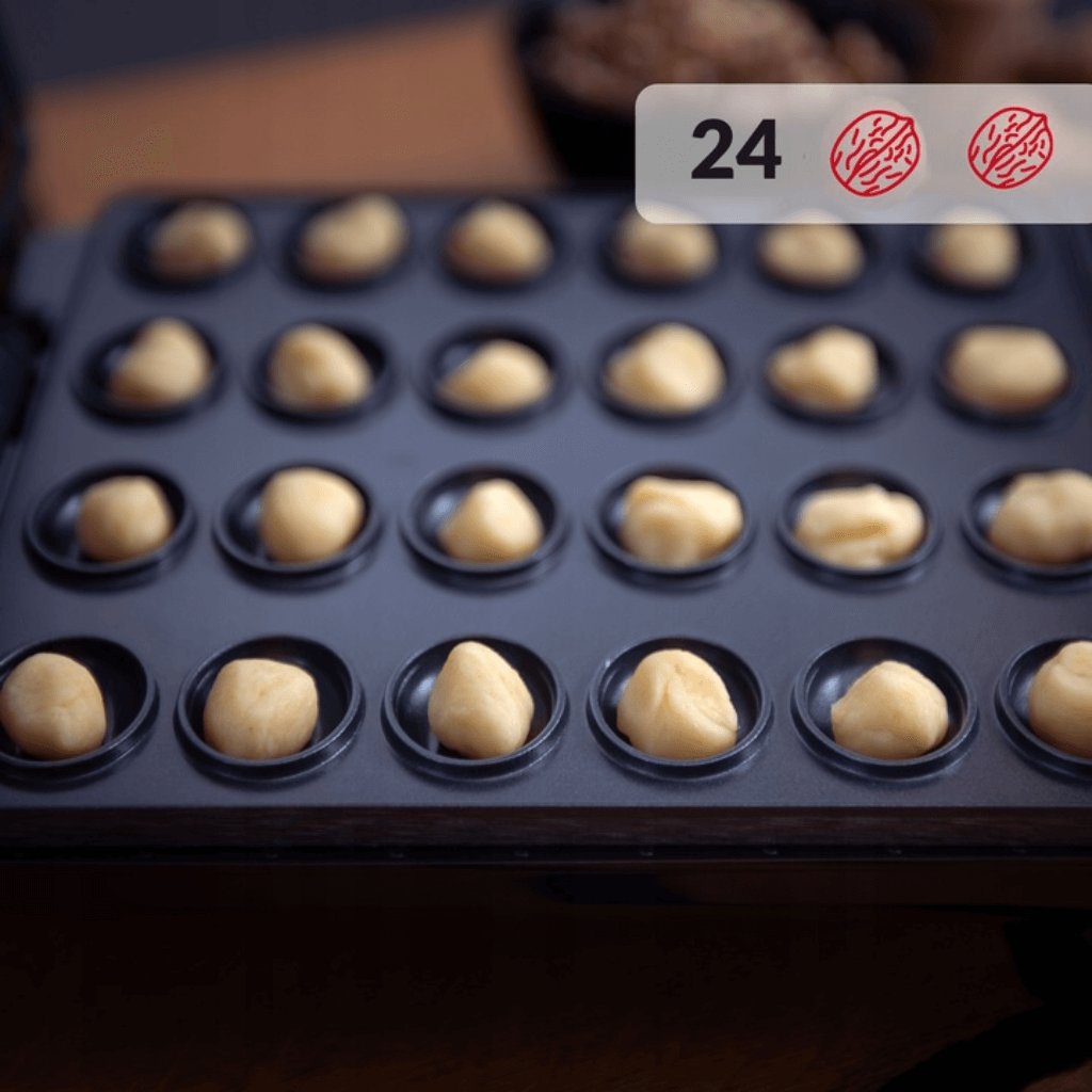 Zariadenie na pečenie sušienok vo forme orieškov naplnených krémom vám umožní rýchlo pripraviť 24 polovičiek pri jednom cykle.