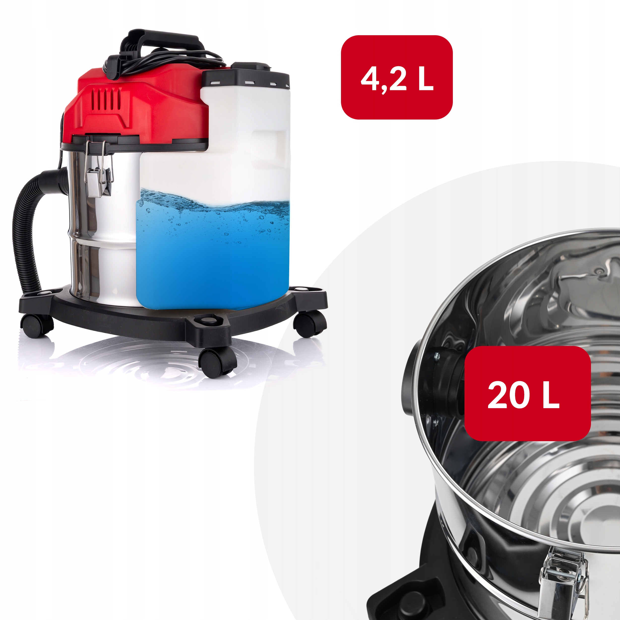 - Veľké nádrže: 4,3 l na čistiaci prostriedok a 20 l na odpad – ideálne pre neprerušovanú prácu doma, vo firme alebo v dielni.
