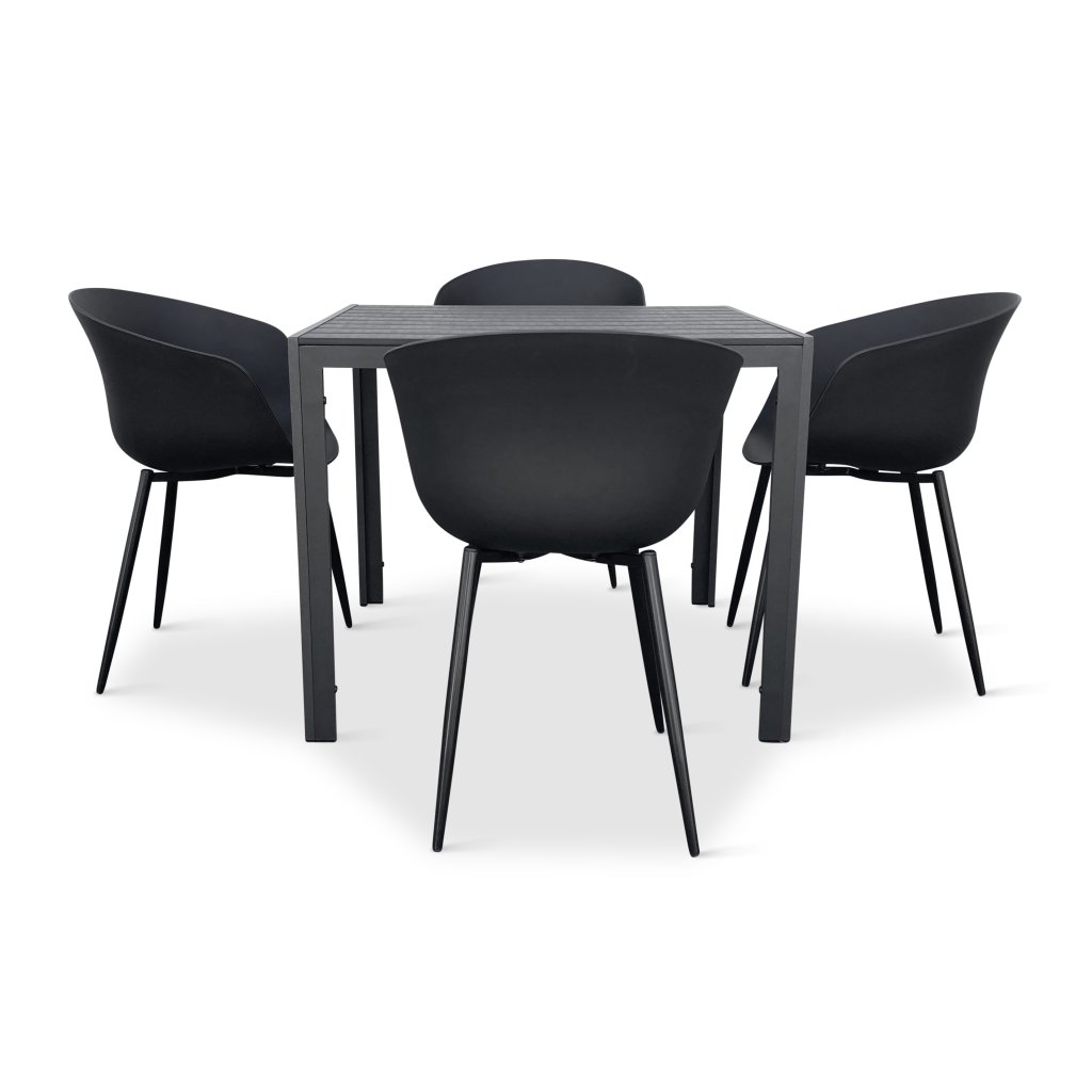 Stôl tvorí Nízkoúdržbový kovový stôl Viking M a 4 Záhradné jedálenské stoličky Rikke.