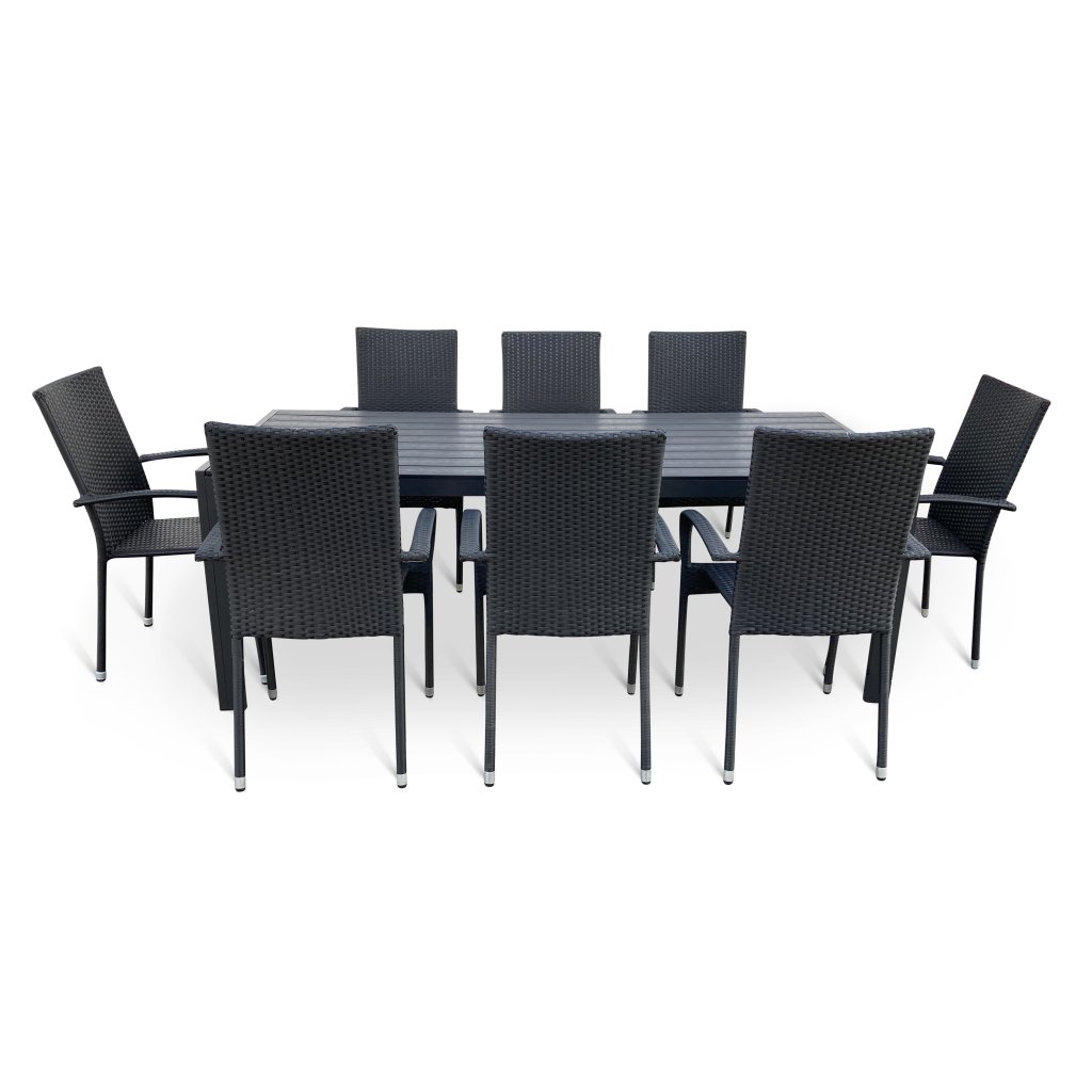 Set tvorí bezúdržbový kovový stôl Viking XL a 8 záhradných ratanových stoličiek Paris antracit.