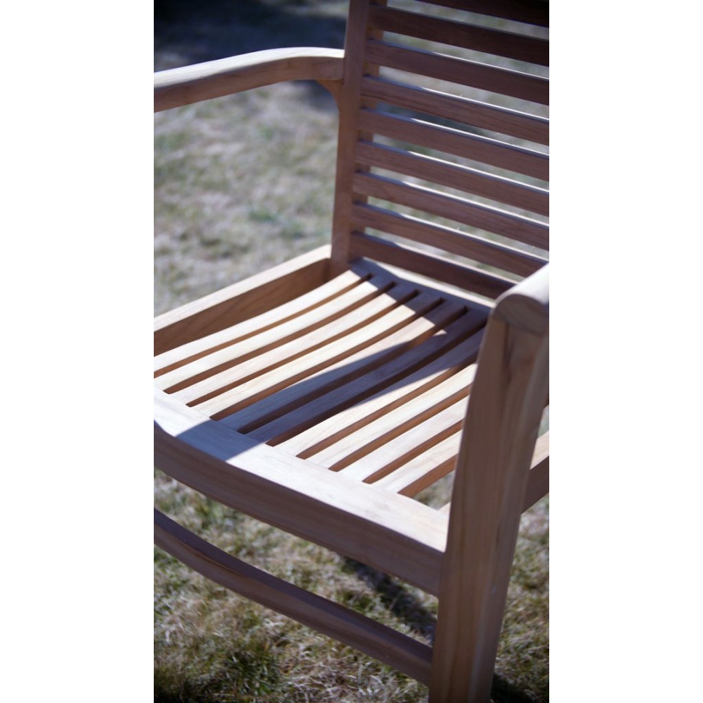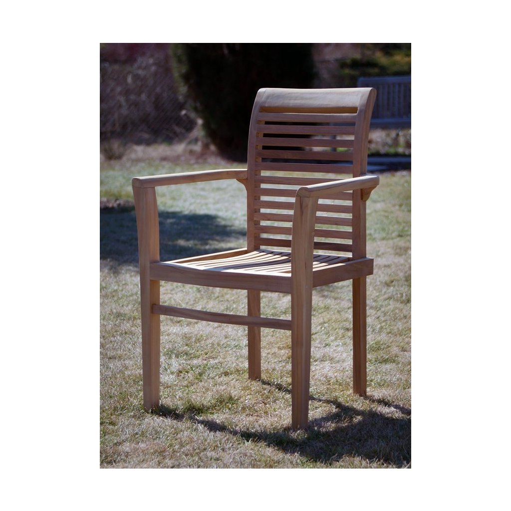 Záhradný stôl dopĺňajú 4 pevné stohovateľné stoličky Stucking s područkami, ktoré sú tiež vyrobené z teakového dreva. Vďaka použitému materiálu je stolička veľmi pevná a stabilná. Nosnosť je až 130 kg.