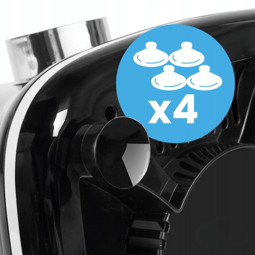 Skleněný kalich je odolný vůči vysokým teplotám, což umožňuje mixovat studené i teplé suroviny. Protiskluzové nožičky zajišťují stabilitu při práci i při vysokém zatížení.