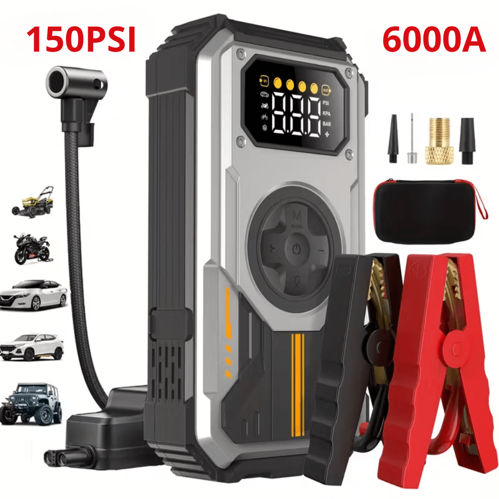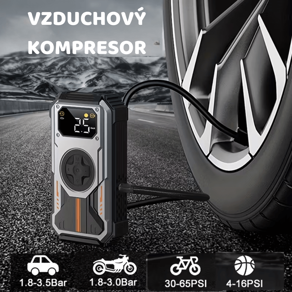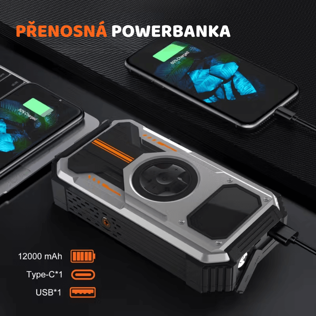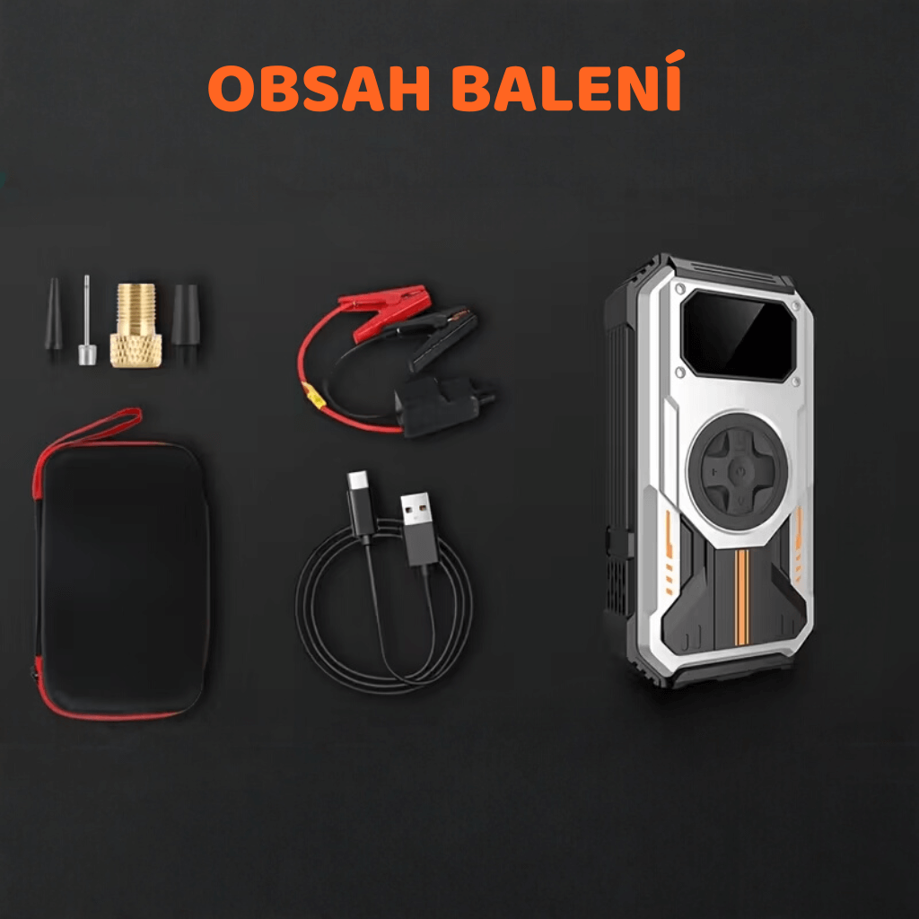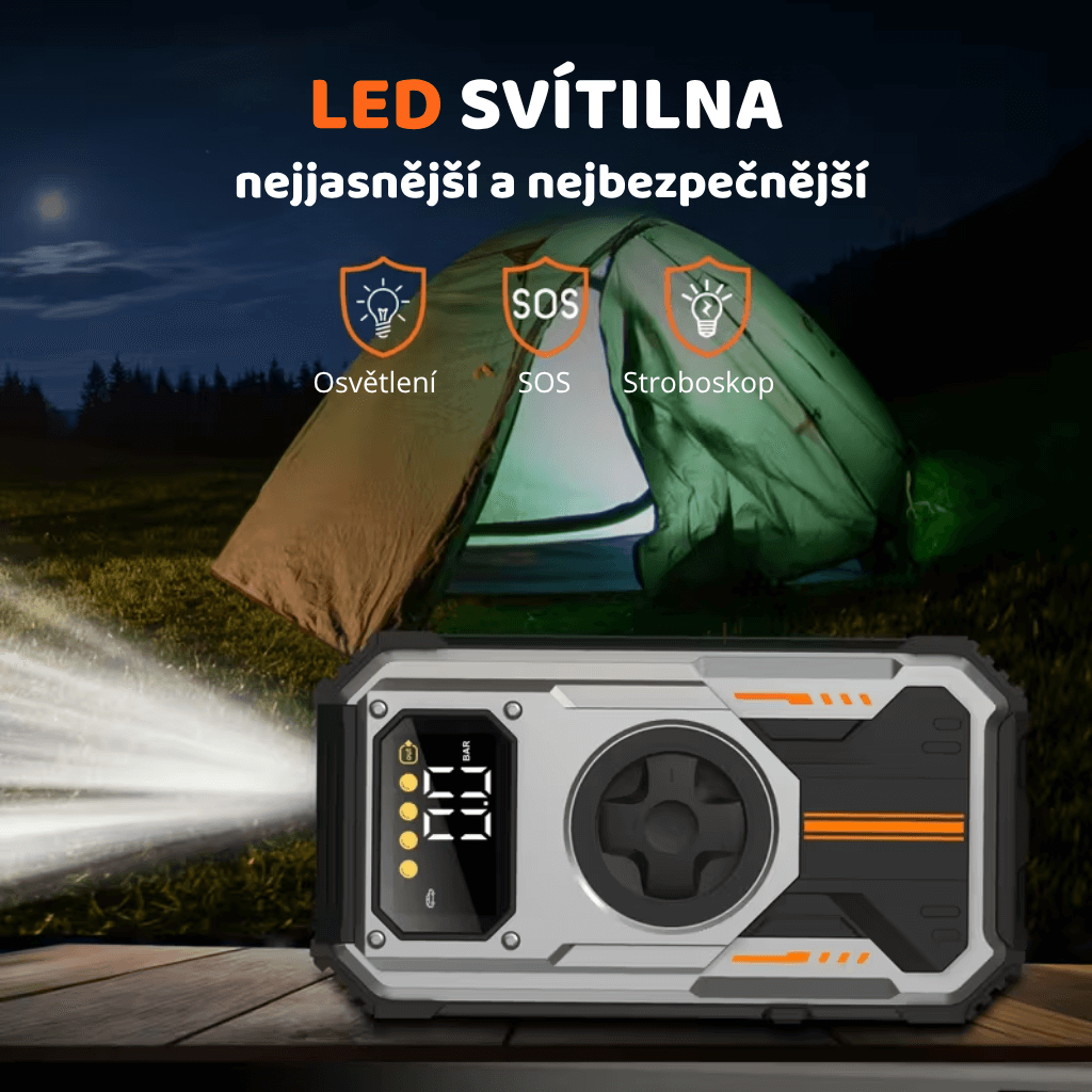 Tento přenosný startér 5v1 kombinuje pět klíčových funkcí do jediného zařízení – nouzové startování, kompresor, měření tlaku, LED osvětlení a powerbanku.