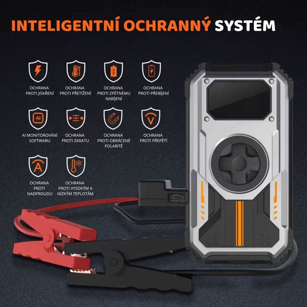 Startér poskytuje špičkový proud 6000 A a díky technologii jednoho tlačítka dokáže rychle nastartovat 12V vozidla i v extrémních podmínkách do −20 °C.