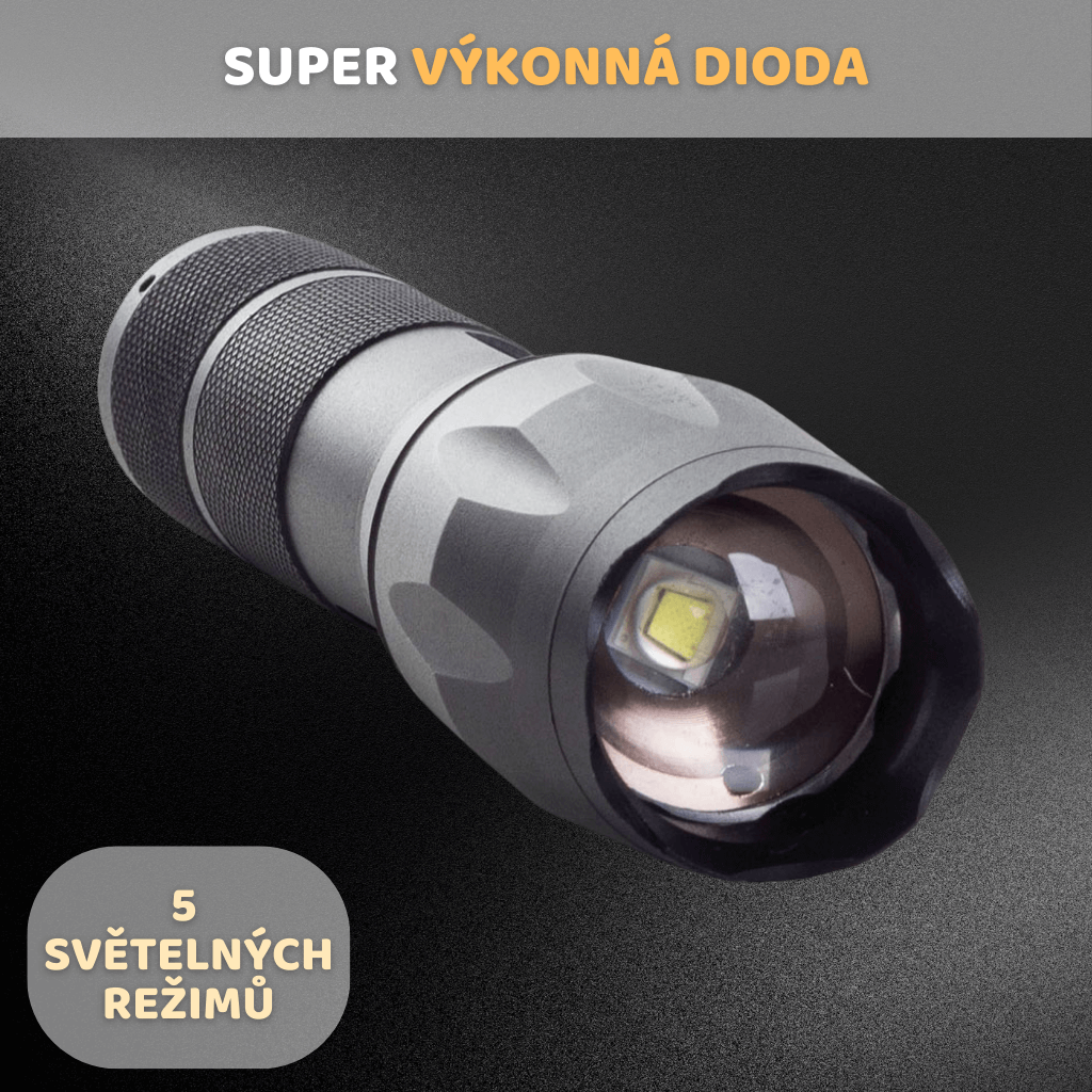 Tato svítilna je vybavena výkonnou polovodičovou diodou CREE T6 XML, která oslní každého. Její životnost dosahuje až neuvěřitelných 100 000 hodin.