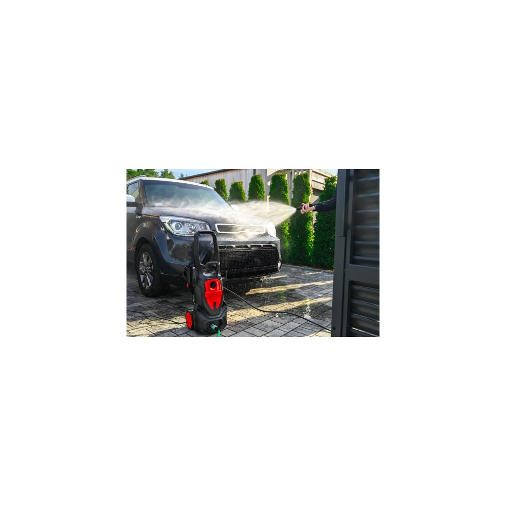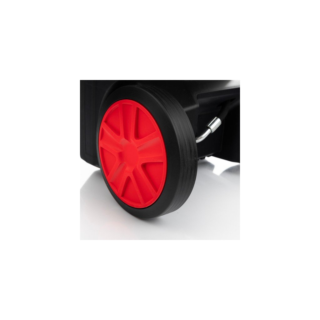 Kolečka na myčce zajišťují stabilitu a snadnou přepravu i po nerovném terénu (jako je trávník nebo štěrk), bez obav z převrácení nebo obtíží při manévrování.