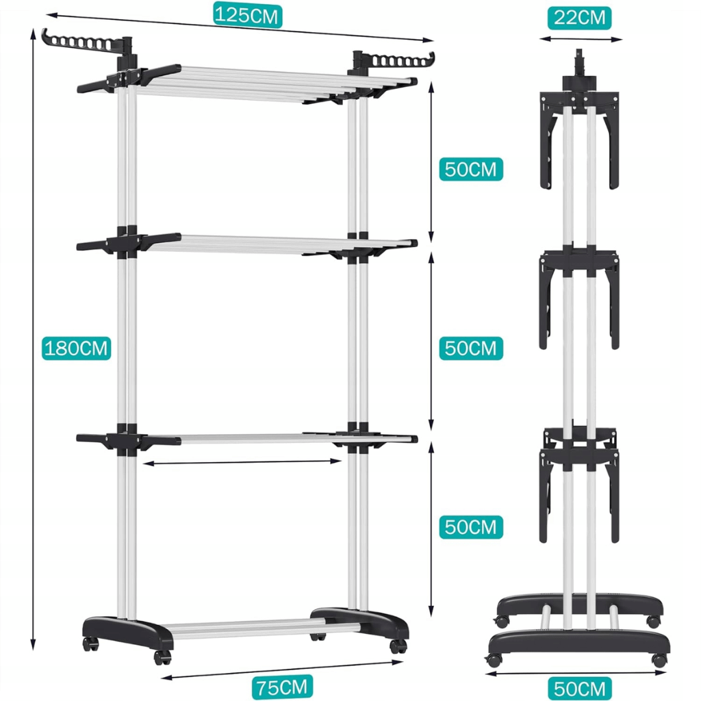 Vertikální rozkládací sušák se šesti policemi a dvěma rameny je kombinací vysoké kvality, užitečnosti a úspory místa v jednom.