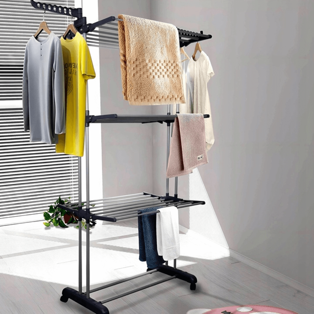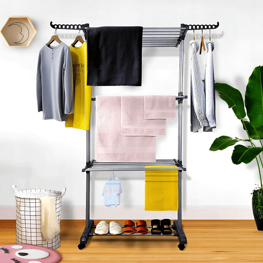 Vertikální rozkládací sušák se šesti policemi a dvěma rameny je kombinací vysoké kvality, užitečnosti a úspory místa v jednom.