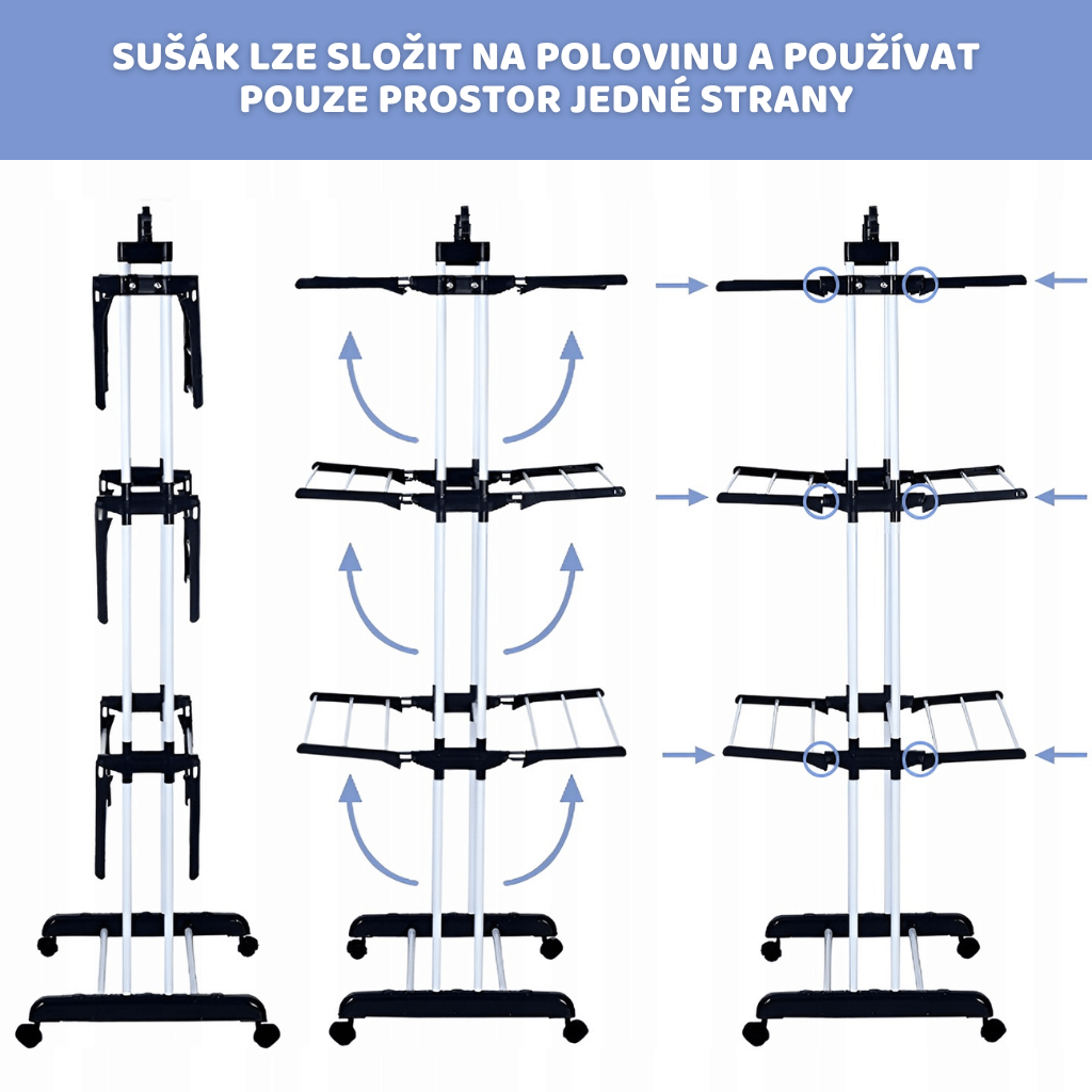 - Sušák lze složit na polovinu a používat pouze prostor po jedné straně