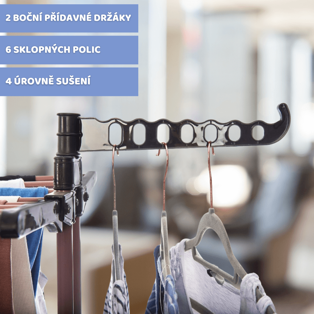 Díky své výšce sušák nabízí místo i pro delší kusy oblečení. Je obohacen o dva boční přídavné držáky , do kterých snadno zavěsíte například ramínko s košilí.