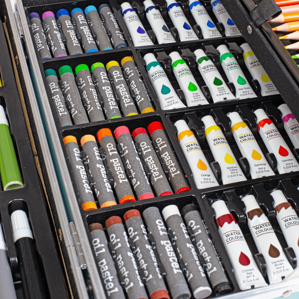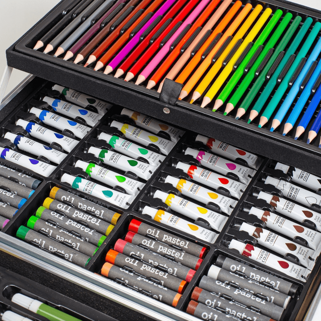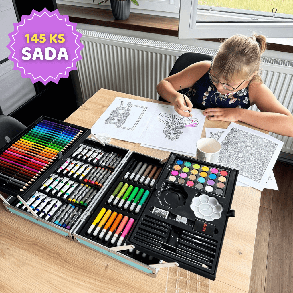 - Kompletní sada 145 dílů – barvy, pastelky, fixy, štětce a další pomůcky