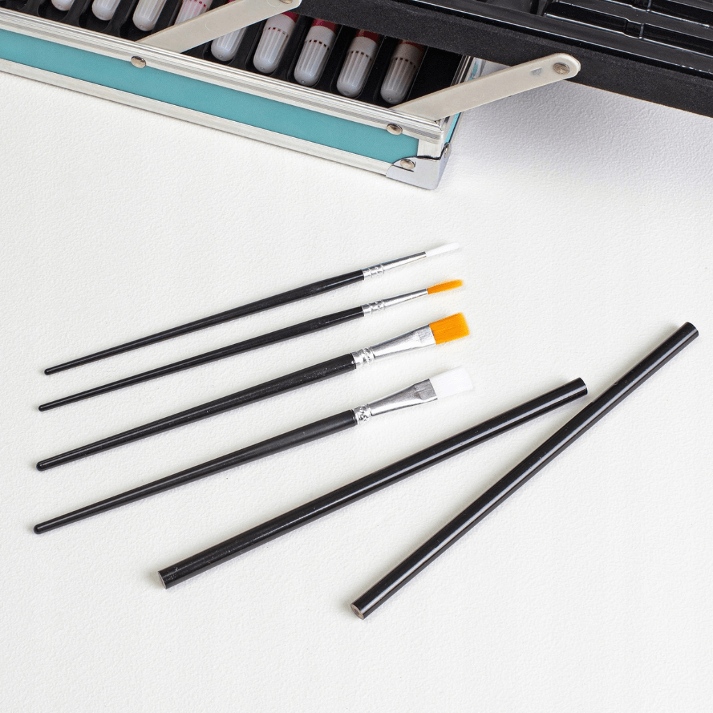 Kromě toho sada obsahuje paletky na míchání barev, tužky, štětce, gumu i ořezávátko – vše, co je potřeba pro začátek tvůrčí zábavy.