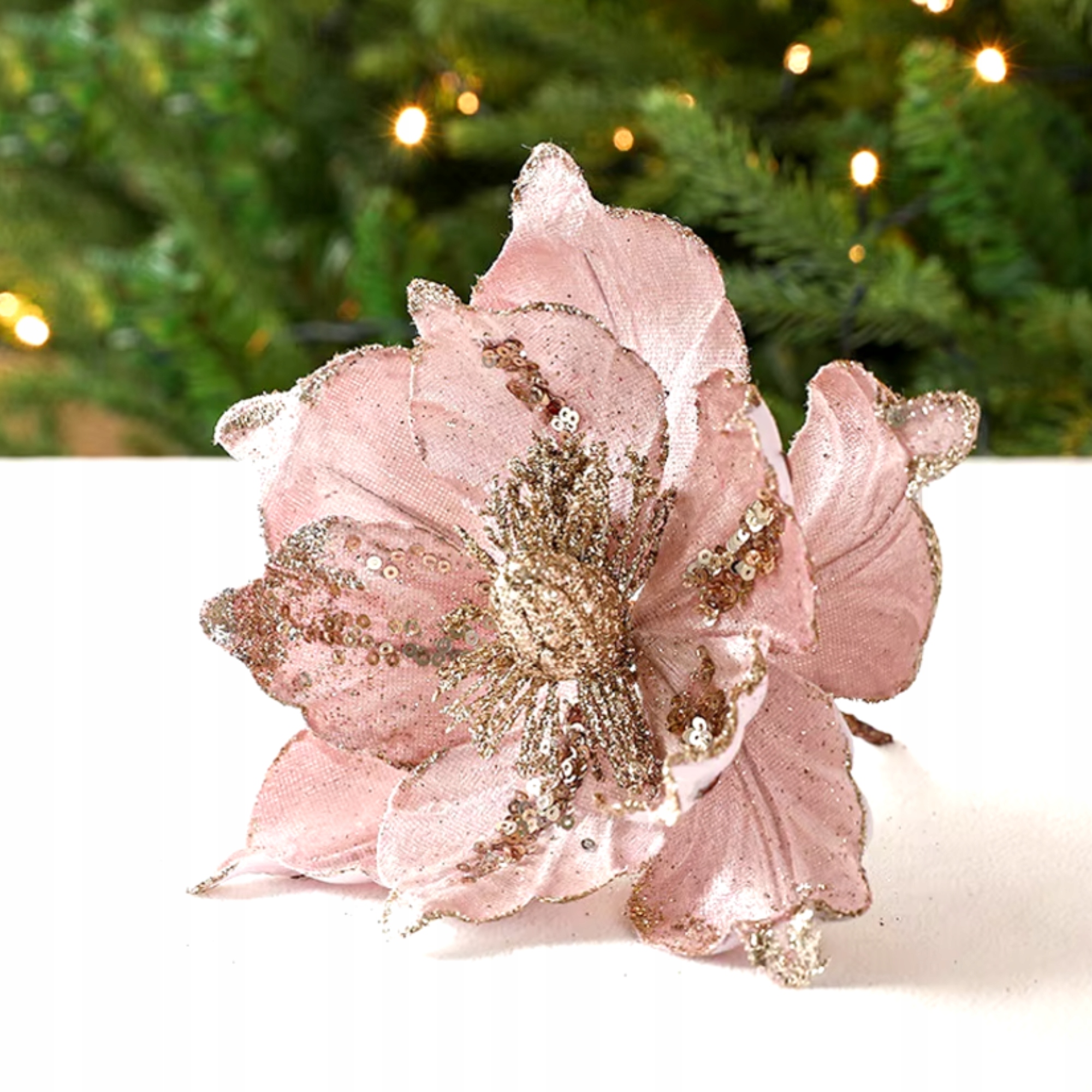 Tato vánoční ozdoba ve tvaru betlémské hvězdy je jedinečným doplňkem vánočních aranžmá. Je vyrobena z materiálu připomínajícího velur, její listy jsou měkké na dotek a jemně se lesknou, což dodává celku eleganci. Drobné flitry a třpytky, které zdobí povrch, způsobují, že se hvězda krásně třpytí ve světle a přitahuje pozornost. Ideální pro zdobení vánočního stromku, věnců nebo jako samostatný dekorativní prvek v domácnosti.