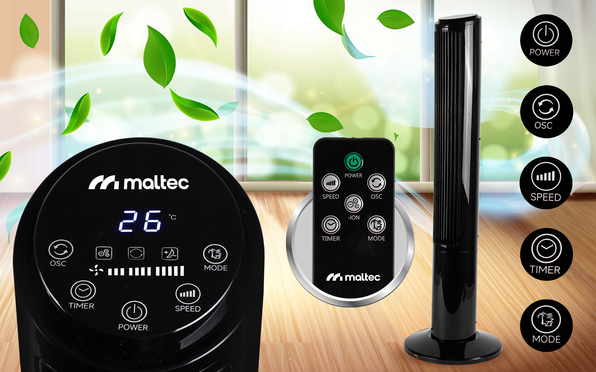 Ventilátor je možné ovládat jak pomocí dálkového ovladače, tak manuálně přímo na dotykovém panelu.