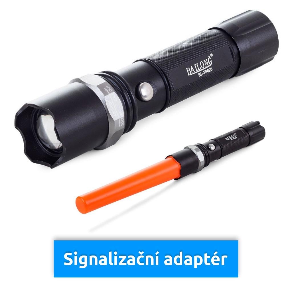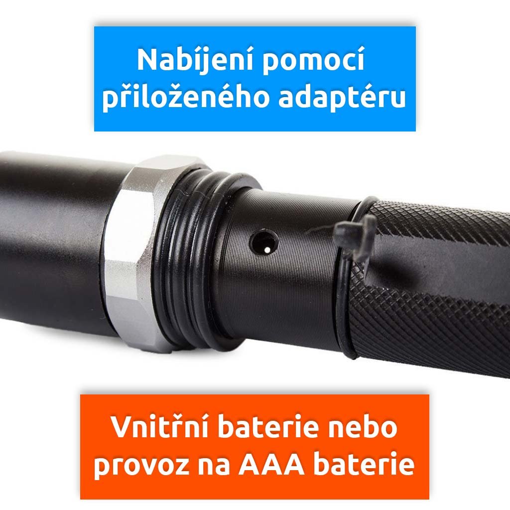 S pomocí přiloženého adaptéru může být dobíjecí baterie nahrazena 3 AAA bateriemi, pokud je to potřeba. Navíc baterka obsahuje signalizační koncovku.