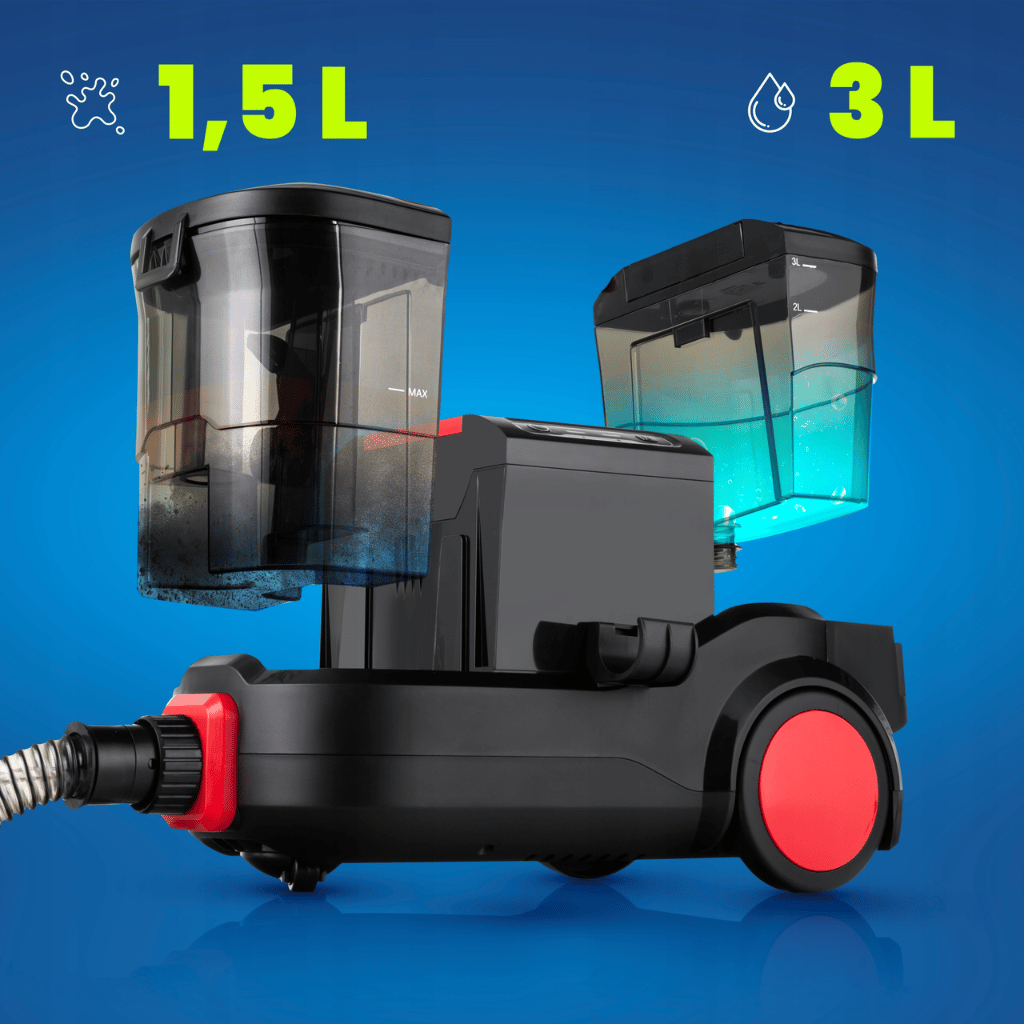 Vysavač využívá oddělené nádrže na čistou (3 l) a špinavou vodu (1,5 l), což zajišťuje hygienický úklid bez opětovného roznášení nečistot.