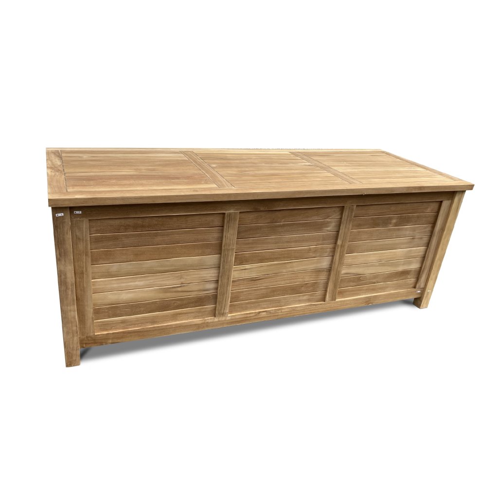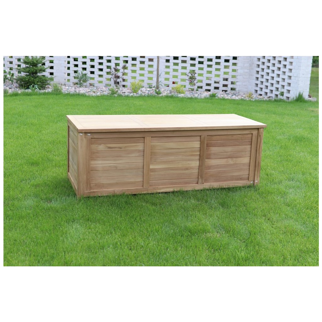 Velká a prostorná dřevěná zahradní truhla z teakového dřeva s úložným prostorem na podsedáky nebo jiné zahradní doplňky a vybavení. Masivní design zahradní truhly. Uzavíratelné víko s písty po stranách pro snadné otevírání. Přirozený vzhled teakového dřeva. Dodávána demontovaná v krabici.
