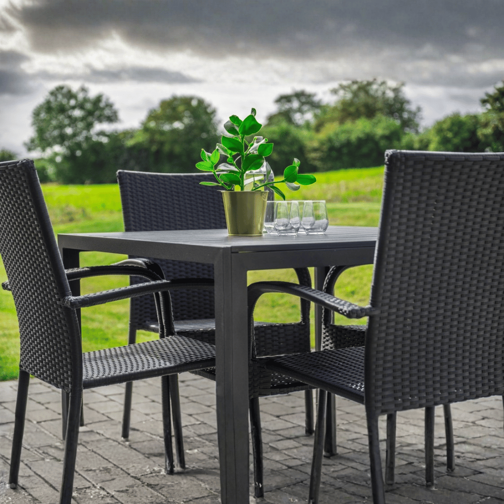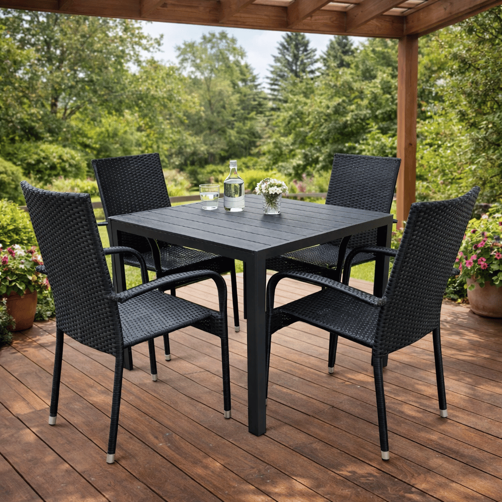 Sestava je ideální pro 4 osoby a tvoří ji zahradní stůl a čtyři ratanové židle, které spolu vytváří elegantní a funkční celek pro každodenní venkovní stolování.