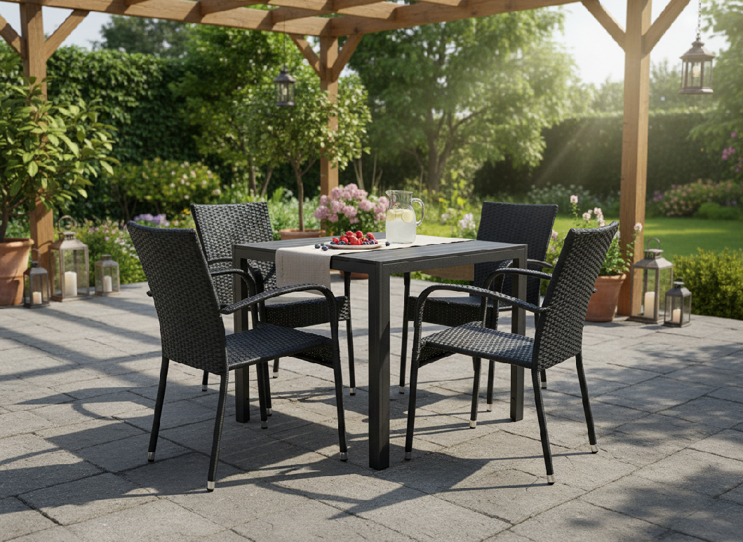 Sestava je ideální pro 4 osoby a tvoří ji zahradní stůl a čtyři ratanové židle, které spolu vytváří elegantní a funkční celek pro každodenní venkovní stolování.