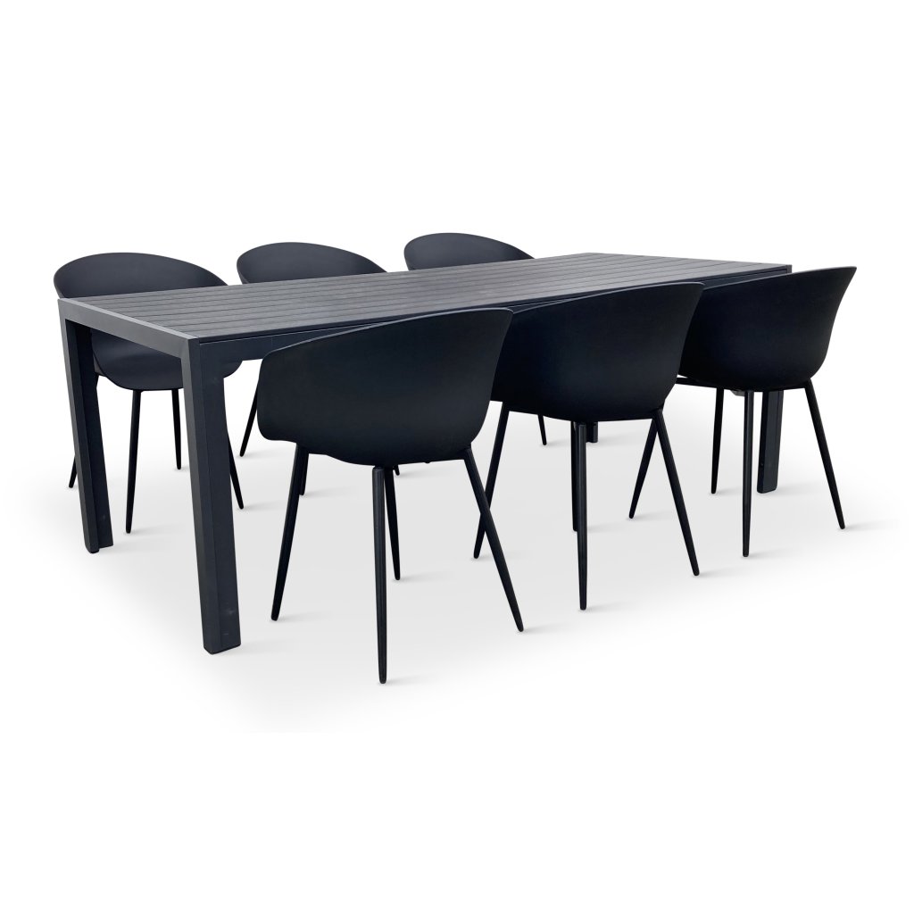 Sestavu tvoří Bezúdržbový kovový stůl Viking XL a 6 Zahradních jídelních židlí Rikke.