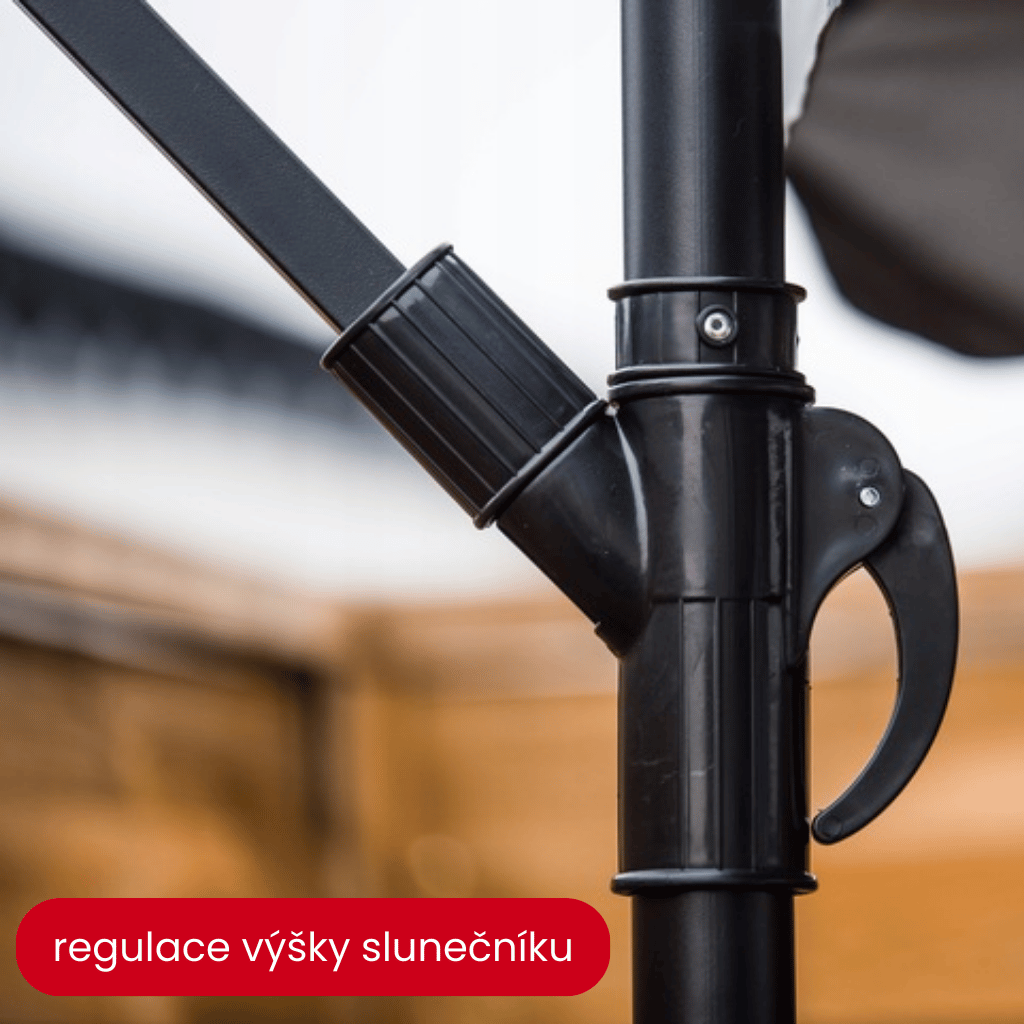 Slunečník umožňuje rychlé a pohodlné nastavení výšky i úhlu naklonění stříšky, takže si jej snadno přizpůsobíte podle uspořádání nábytku nebo výšky uživatelů.