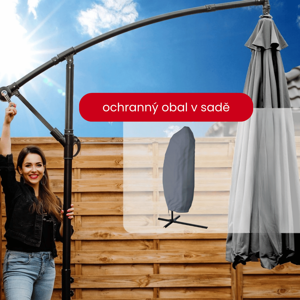 Součástí balení je ochranný potah v barvě slunečníku, který ho chrání před deštěm, sněhem, větrem, UV zářením i prachem.