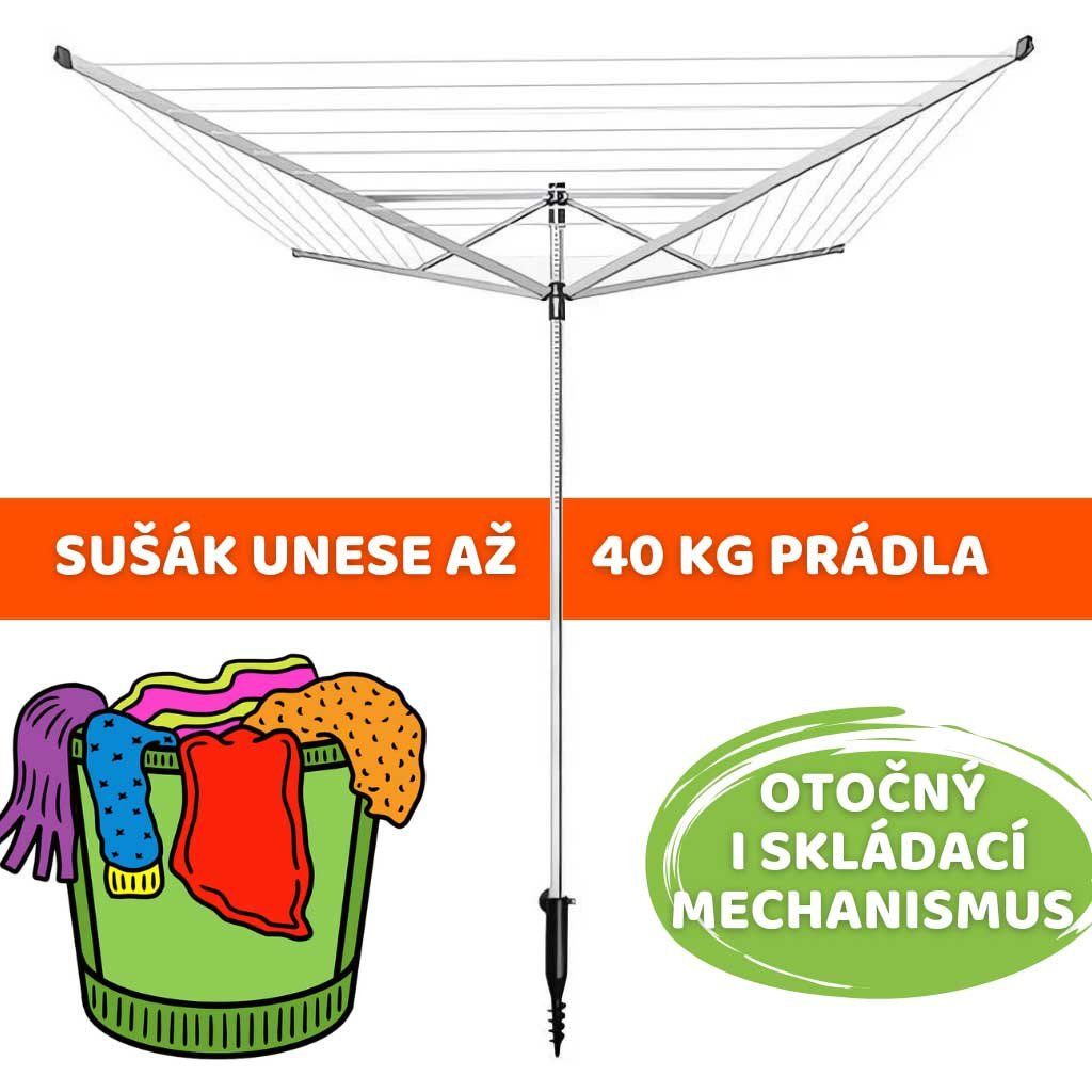 Sušák je vybaven 48 odolnými linkami uspořádanými na 4 ramenech, přičemž každé rameno tvoří trojúhelníkový modul s 12 linkami. Celkem tak máte k dispozici 50 metrů sušící linky.