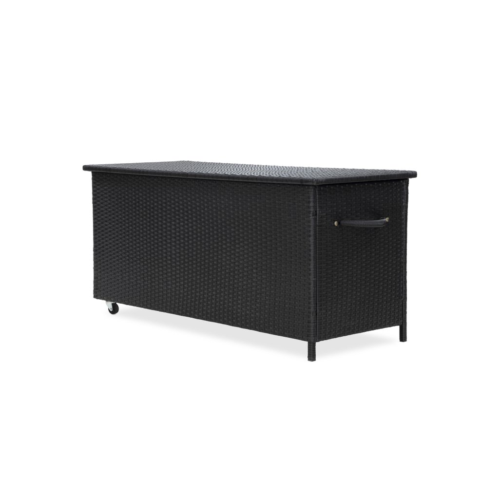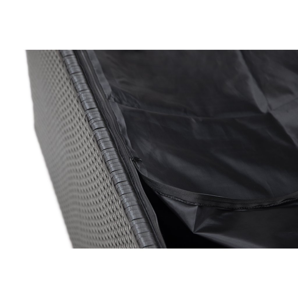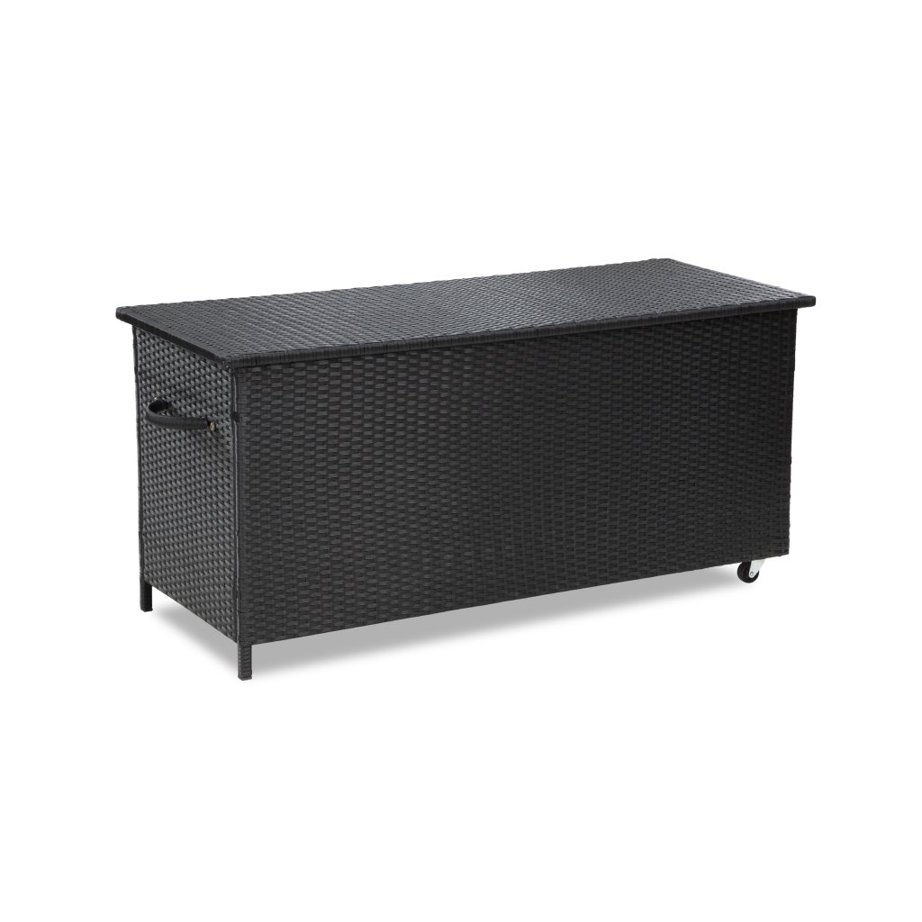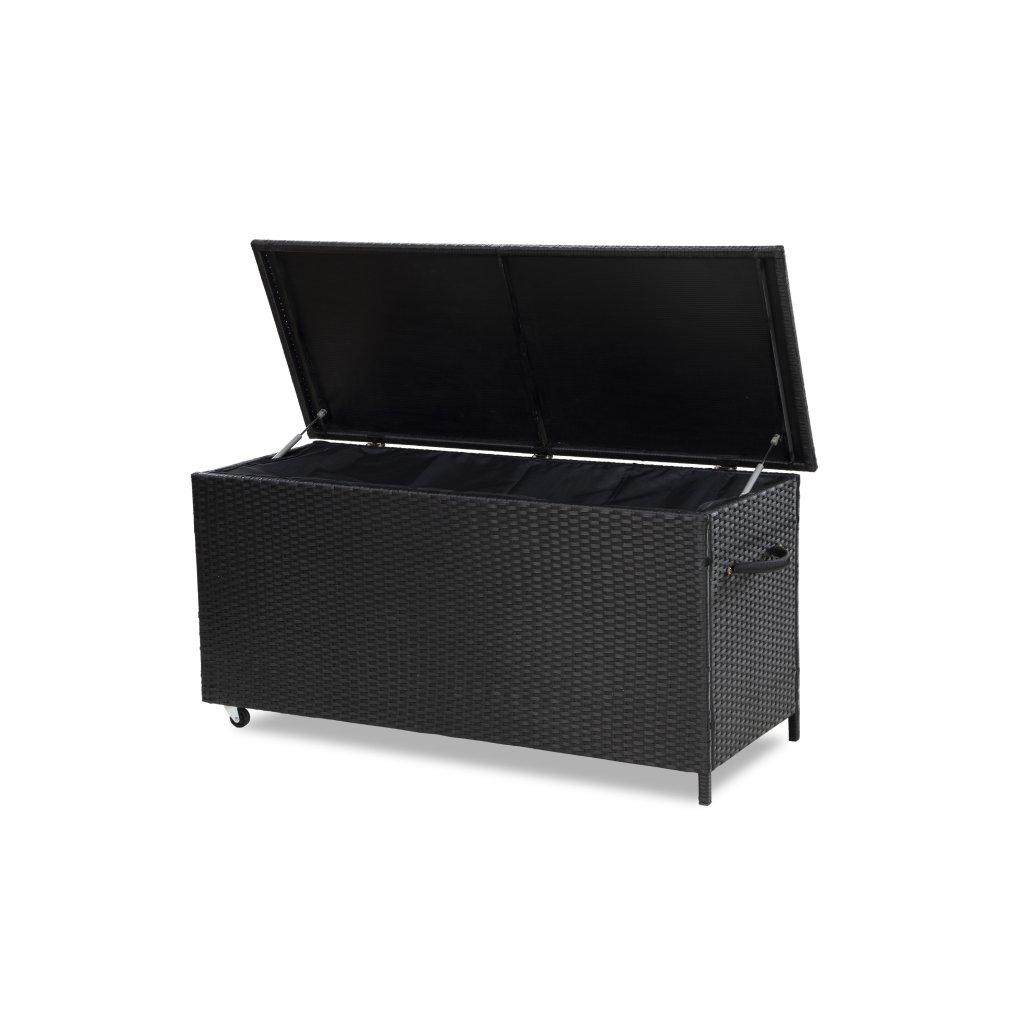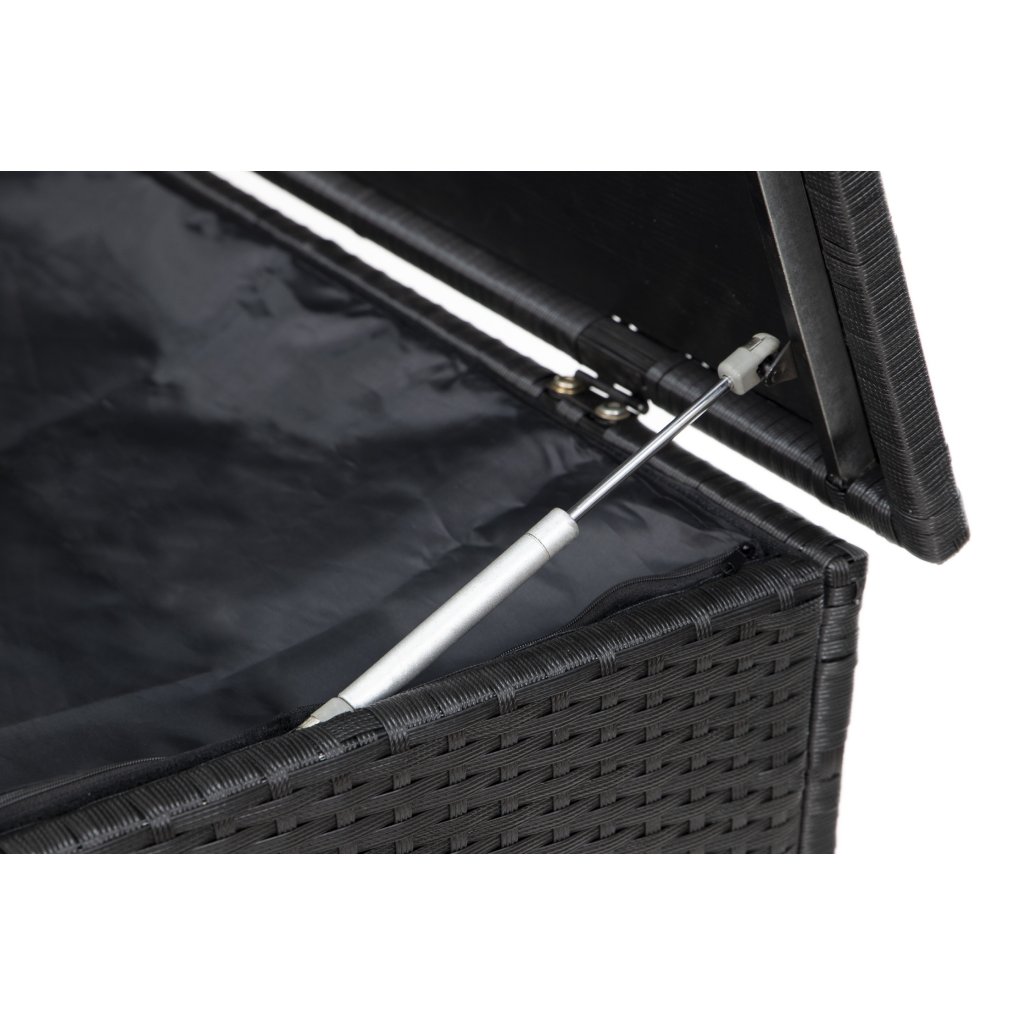 Nepromokavý úložný box Chico z umělého ratanu. Ocelová konstrukce ošetřena práškovým lakem proti korozi. Nepromokavá folie na spodní straně víka chrání úložný prostor před vlhkem. Otevírání víka usnadňují 2 písty po stranách. Namontovaná kolečka a madlo pro snazší manipulaci. Uvnitř uzavíratelná vložka na zip. Díky atraktivnímu černému provedení je nejen praktický, ale navíc i skvěle vypadá. Ideální pro uskladnění polstrování a drobného zahradního nářadí a vybavení.