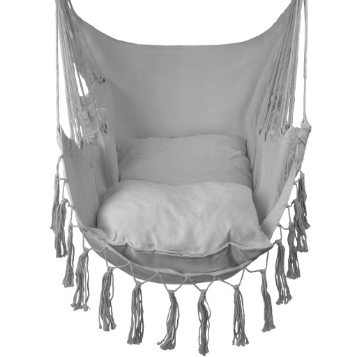 Závěsné křeslo bylo vytvořeno s využitím jemných makramé pletenin, které vyzařují boho styl a přirozenost.