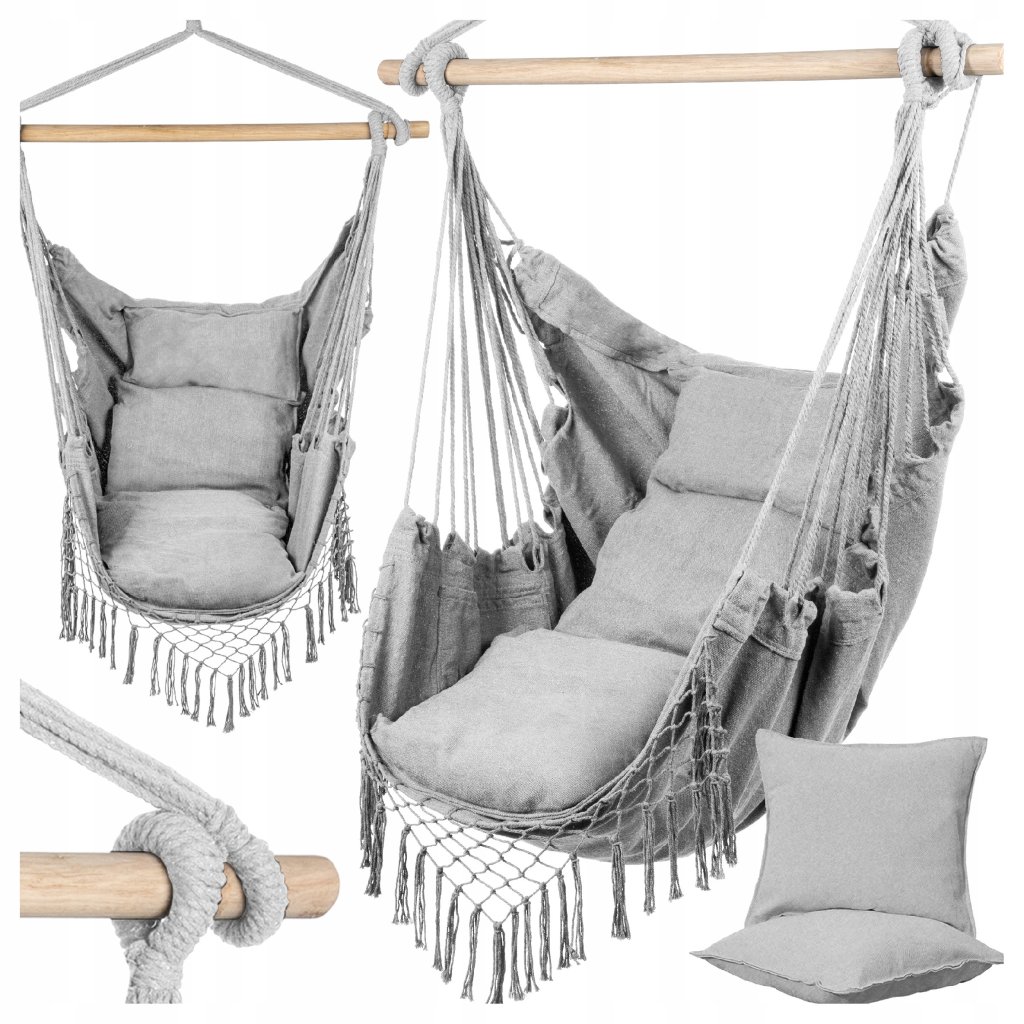 Závěsné křeslo bylo vytvořeno s využitím jemných makramé pletenin, které vyzařují boho styl a přirozenost.